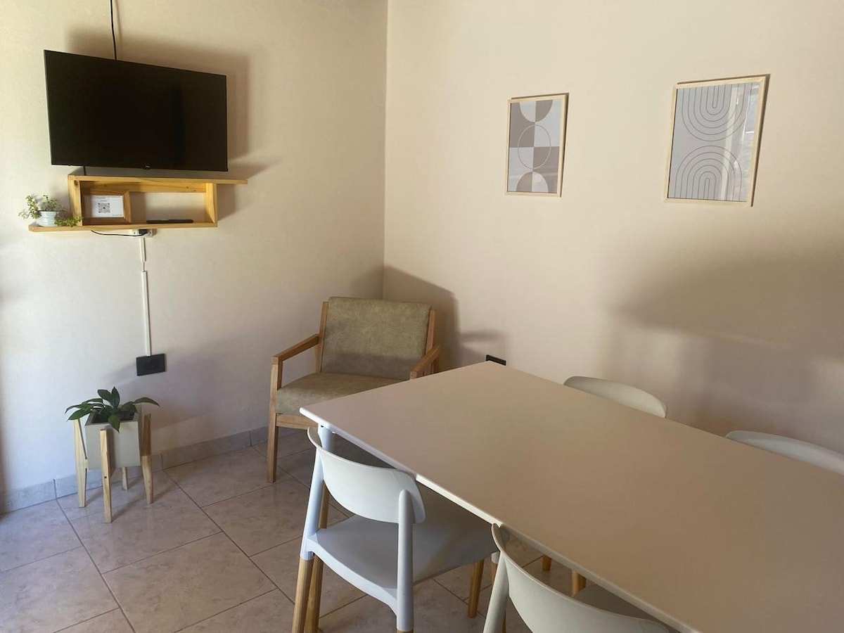 Departamento totalmente equipado hasta para 5 personas. Cuenta con: - Una habitación con cama matrimonial -Una habitación con 2 camas de plaza y media -Baño completo en planta alta -Ropa Blanca -Cocina totalmente equipada en planta baja -Toilette en planta baja -Sillon cama -TV -Internet -Cochera techada privada -Chulengo