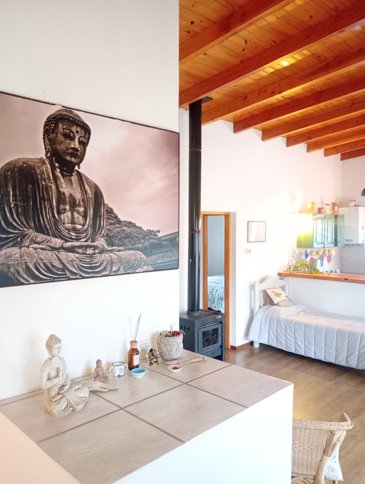 We invite you to enjoy our Patagonian loft, located on the ground floor, with no stairs to access but with a wooden deck over a beautiful patio. It has 1 bedroom with 1 double bed and 1 single bed, kitchen, living room, bathroom and laundry room. We offer a stove to enjoy the winter, a large garden, refrigerator, gas heating, kitchen, washing machine, Smart TV with DirectTV and WiFi. You will also have semi-covered space to store 1 vehicle.