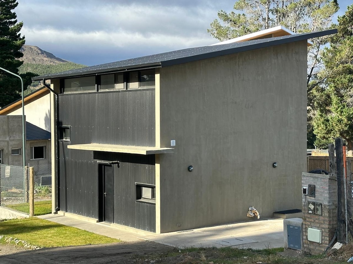 Es una Loft tipo alpino con un entrepiso, el frente es todo vidriado que hace que tengamos todo el día una vista única a la cordillera, al cerro 21 y La Hoya a lo lejos, con el Nahuel Pan de fondo haciéndonos sentir como si estuvieramos adentro de un cuento. Es una propiedad nueva y moderna, de construcción tipo industrial, con madera y detalles en hierro negro, pareciera que es sacada de una pelicula sin dudas. Sentir el calor de los leños construyen una parte mágica de nuestra estadía.