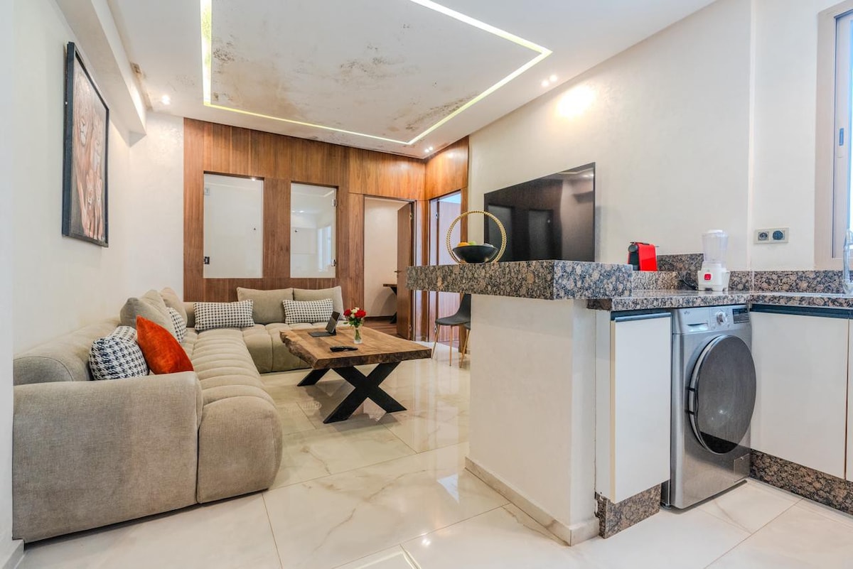Appartement lumineux et raffiné de 100 m², subtilement décoré dans un esprit marocain élégant, mobilier sur-mesure et finitions soignées. Il offre 2 chambres pleines de charme, un salon spacieux avec cheminée et coin repas, une cuisine ouverte toute équipée, une grande salle de bain et deux balcons baignés de soleil. Parfait pour un séjour à deux, en famille, entre amis. Nichée dans un quartier authentique et vivant, à deux pas des commerces, à 10 minutes de la plage et 20 min de la Médina.