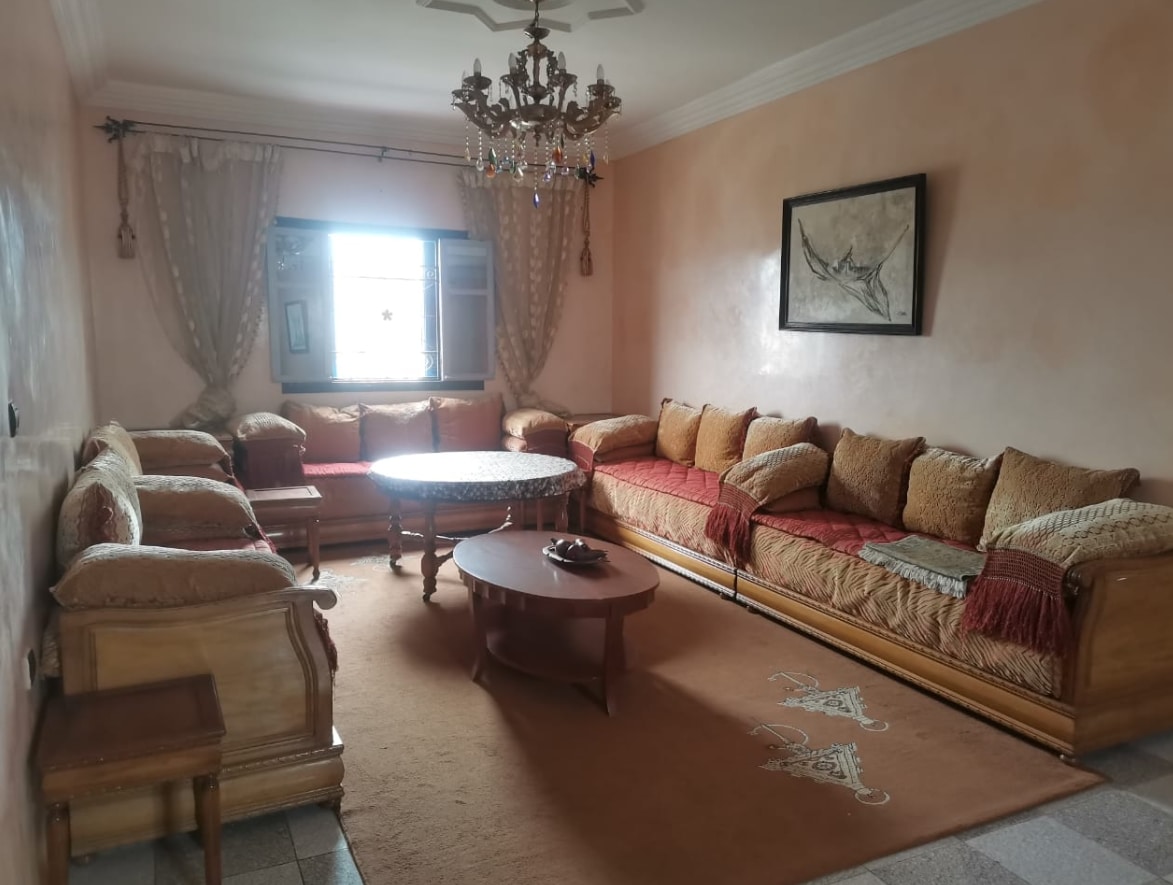 Bel appartement situé à 100 mètres de la plage proche de tous commerces, Au 1er étage d’une petite résidence récent et bien entretenu dans quartier calme, Elle offre: 3 petits balcons . deux chambres double et 1 salle de bain et la douche indépendante , Un salon avec cheminée TV (écran plat) et Internet WIFI ainsi qu’une cuisine et une salle à manger entièrement équipée (lave linge, frigo, four, plaque gaz). Luxueusement meublé et décoré dans un style marocain moderne et parfaitement équipé.