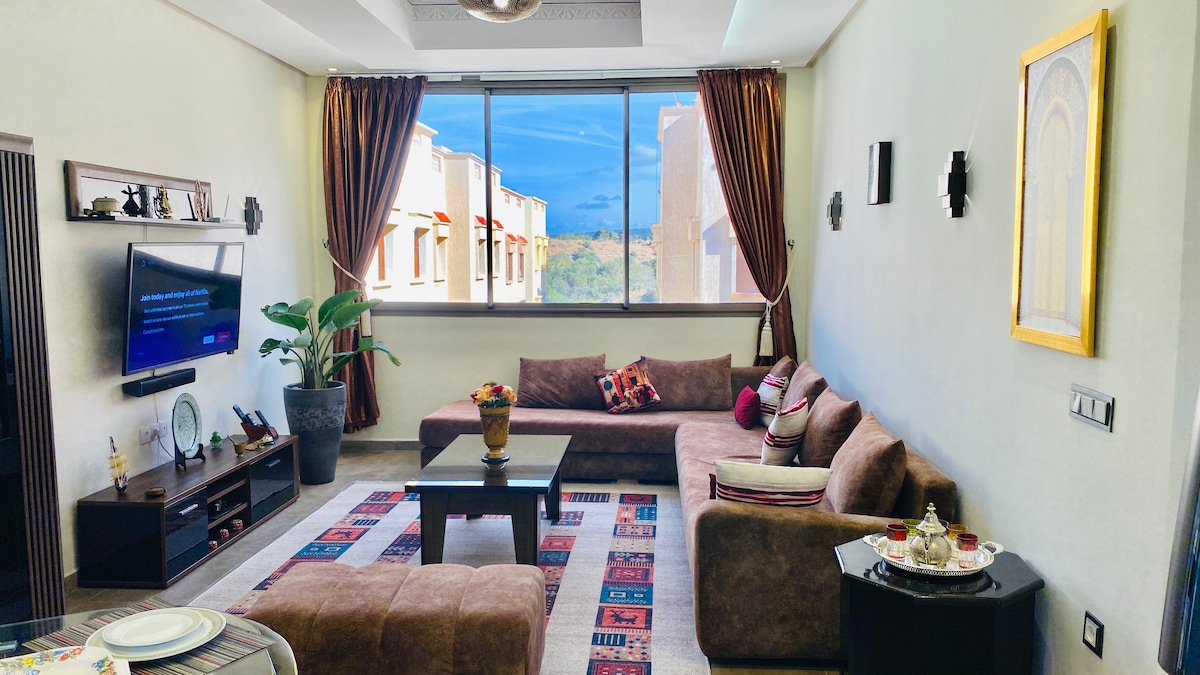 Modern, bright, and comfortable apartment located in a new building in the Erraounak district, ideal for families, couples, or business travelers. The apartment features large windows offering views of the forest and plenty of natural light throughout the day. Just a 10-minute walk from the beach and close to shops and supermarkets, you'll enjoy a convenient and pleasant location.