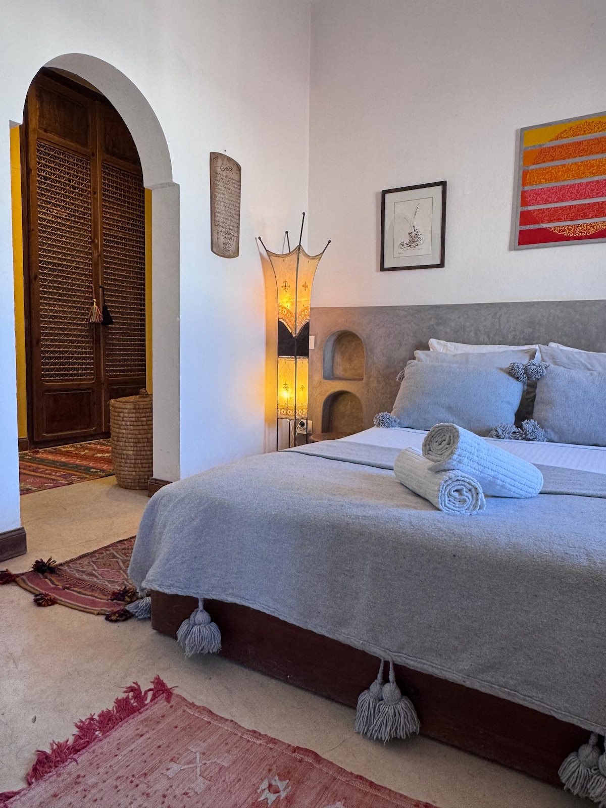 Chambre de charme dans appartement marocain atypique – Médina d’Essaouira ✨ Plongez dans l’âme d’Essaouira en séjournant dans une chambre pleine de caractère, nichée au cœur de la médina. Entre murs texturés, touches artisanales et ambiance chaleureuse, ce lieu respire l’authenticité marocaine tout en offrant le confort nécessaire pour un séjour agréable.