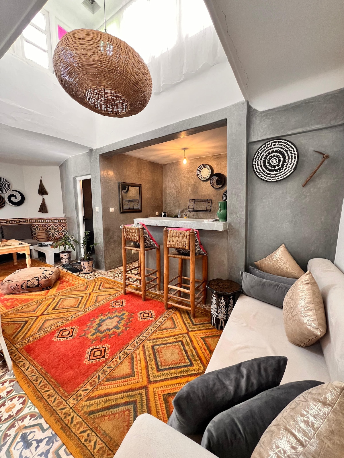 MarOne's retreat offers a charming 1st floor studio nestled in the heart of Essaouira's enchanting old medina, just 2 min walking from the park, a short stroll from the port, main square, and beach This inviting studio features a cozy living room/ mini kitchen/ shower toilet and a main bedroom ( en suite). Situated within a traditional Moroccan house, it provides a unique opportunity to immerse yourself in the authentic lifestyle of the local population and embrace a new cultural experience.