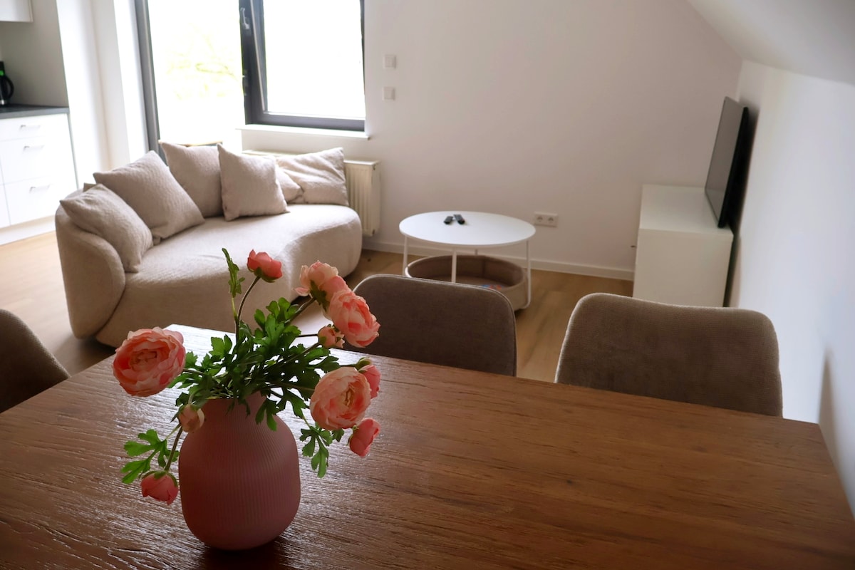 Whether you are traveling for business, tourism, or personal reasons: The apartment is perfect for you if you are looking for a cozy and modern temporary home. Especially ideal is the workspace with a height-adjustable desk. With 250 Mbit/s, you can surf and stream without any problems. Free parking is available at the house. The apartment has a double bed, a sofa bed, a fully equipped kitchen, and a balcony with a view of the greenery, Netflix, and a fitness area.