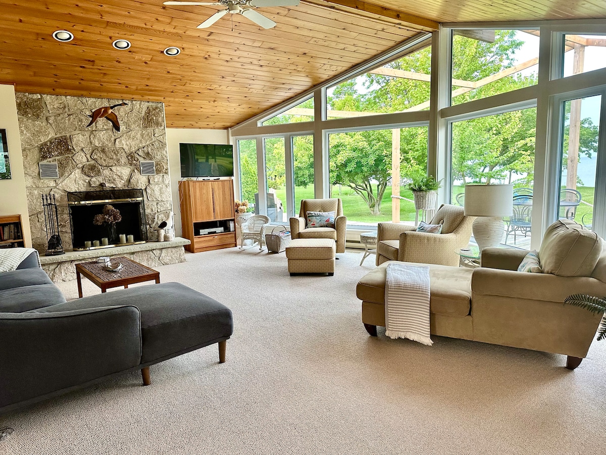Prepare to fall in love with this adorably tropical home, fully winterized for year-round enjoyment. You will never to want to leave because luxury awaits you at the all-season Sunrise Beach House. The property is truly heaven on earth with magnificent private soft sand beach and spectacular water views, guests agree this is the perfect spot to call home, swim in the lake, relax on the beach and take in the remarkable sunrises and moon-rises over the water.
