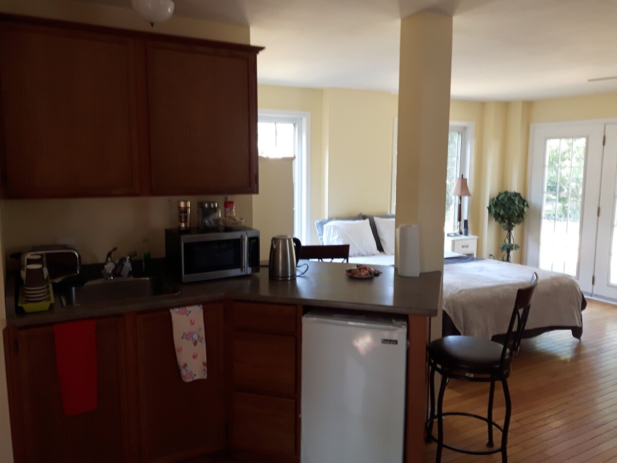 Guests will enjoy our quaint private getaway. Our suite is set above our detached garage. Open concept. Supplied with linens, towels etc for your short getaway. Enjoy all the local wineries, golf courses, breweries, shopping, restaurants. Essex Counties best kept secret. Colchester harbour, with Colchester beach is only a minute away. A separate private sitting area for you to enjoy your stay. We supply bottled water, coffee, coffee cream. Assorted tea, sugar, freshly made banana bread.