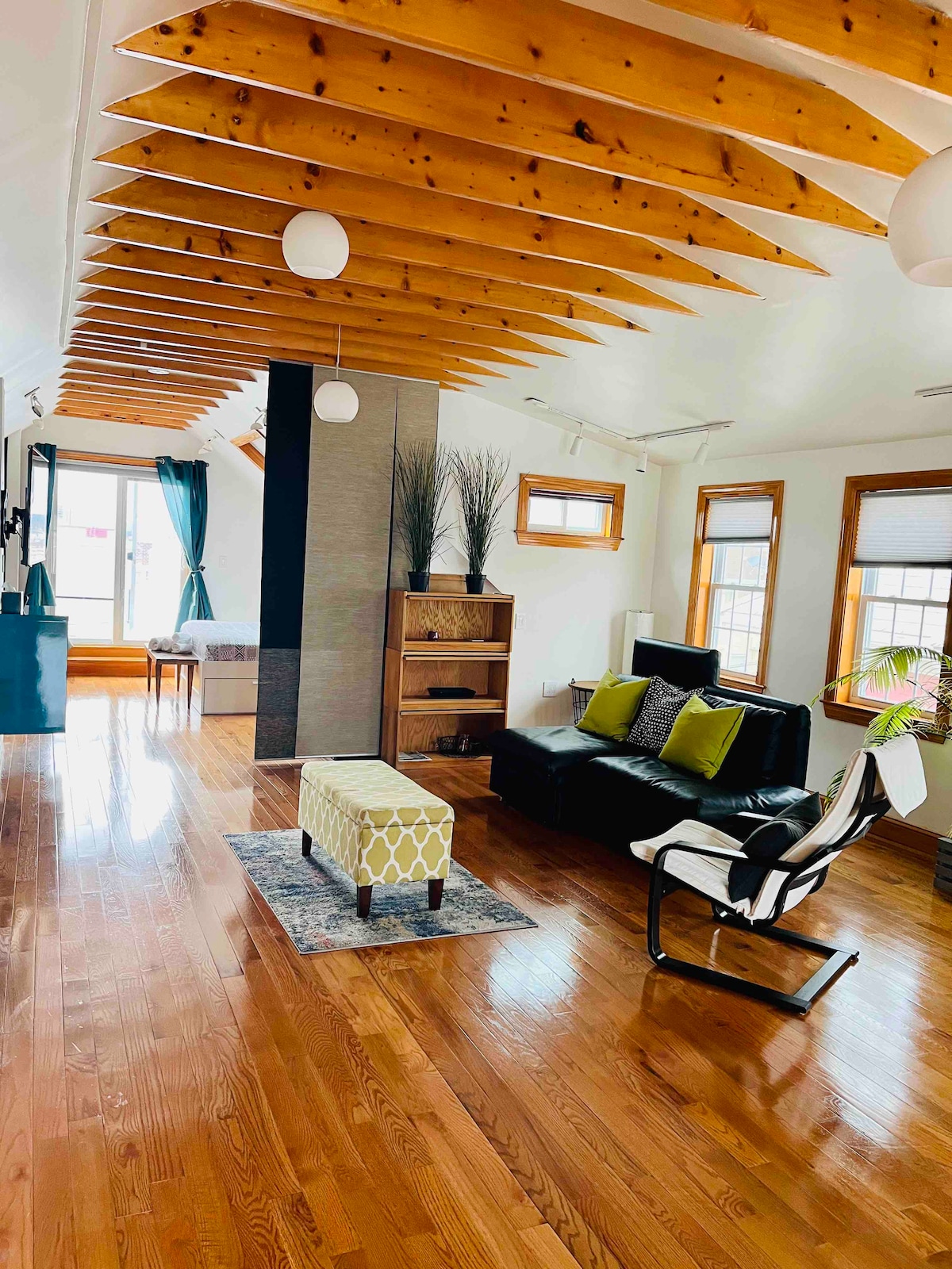 Beautiful open-space loft just 5 miles from Downtown Boston and 4 miles from Harvard Square! Features a king bed and a twin bed on opposite sides, separated by a wall, panel divider, and Oriental screen for privacy. Enjoy a rustic-modern design in a safe neighborhood, steps from shops, restaurants, bus stop, and 8-min walk to subway. 10 min to Logan Airport, 5 min to Encore Casino. Note: Jacuzzi out of service; bathtub should not be filled. ID required for primary renter.