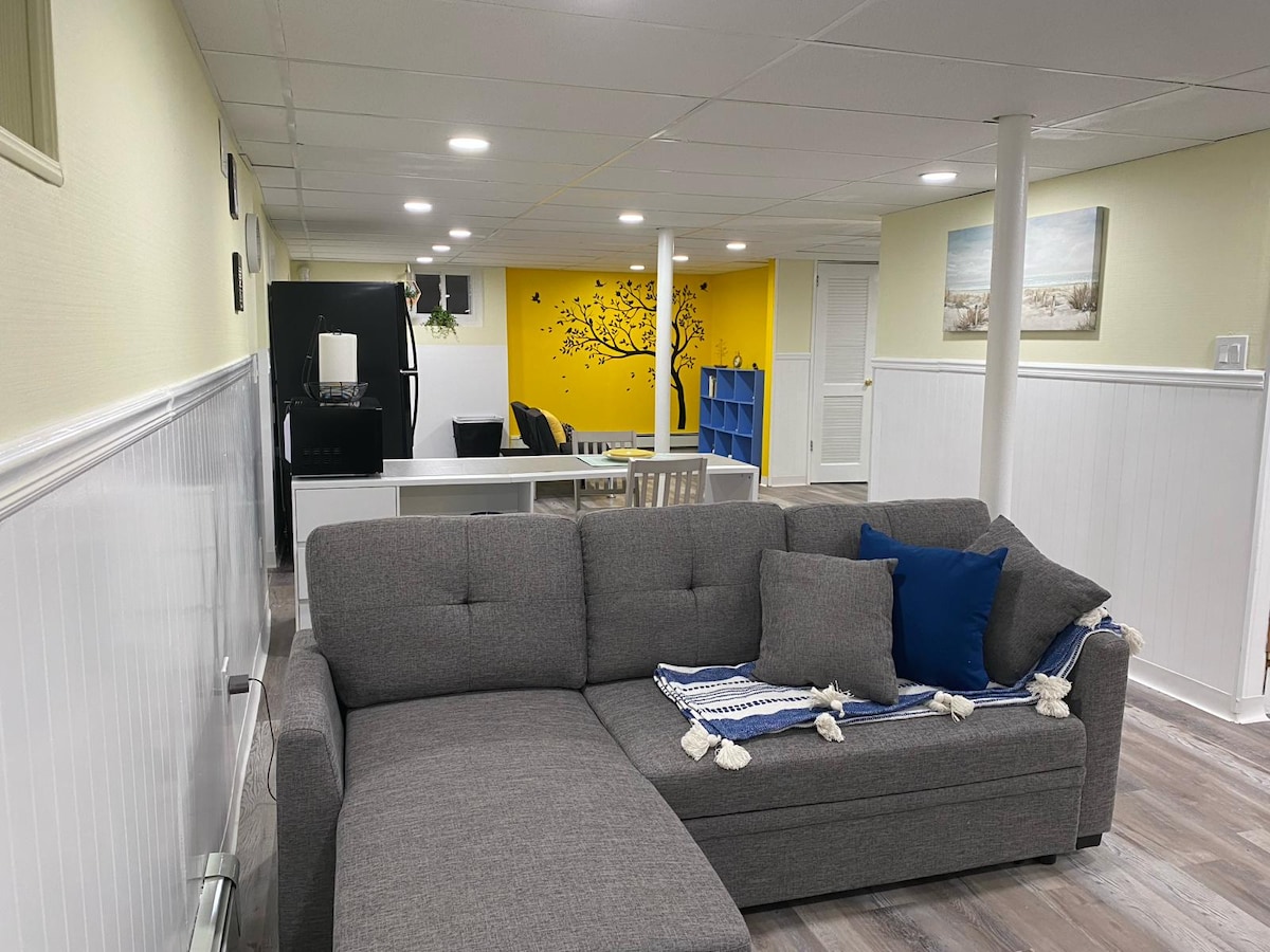 Private cellar located in basement of home —mins from Seaton Hall, 5 mins from eateries & shops, 15 mins to Newark, train ride to NYC. Come here to slow down, cozy up and unwind. Featuring 1 bdrm w/ queen bed, 1 open room w/ a queen Murphy bed, 1 bathroom w/ shower, theater room, sauna and glass enclosed lounge. The cellar is located in our 1890 Victorian home designed by famed architect Percy Griffin. Private access is provided through a well lit exterior basement door. We’d love to host you!