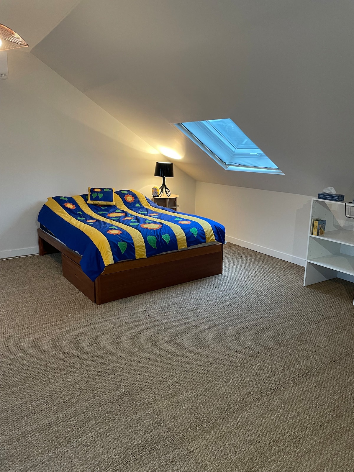 Vous apprécierez le calme et la luminosité de cette chambre mansardée. Au 3ème demi-étage d'une villa avec jardin située à 750m du RER B, la chambre (lit 160 cm) possède des toilettes et une grande salle de bain privative avec rangements. La chambre se ferme à clé. Une bouilloire est à disposition dans la chambre. Nous acceptons votre animal de compagnie sur demande (2 chiens et 4 chats dans la maison). Le petit-déjeuner est inclus.