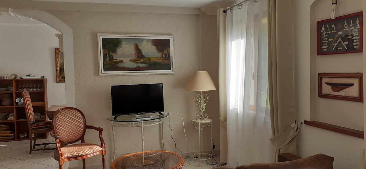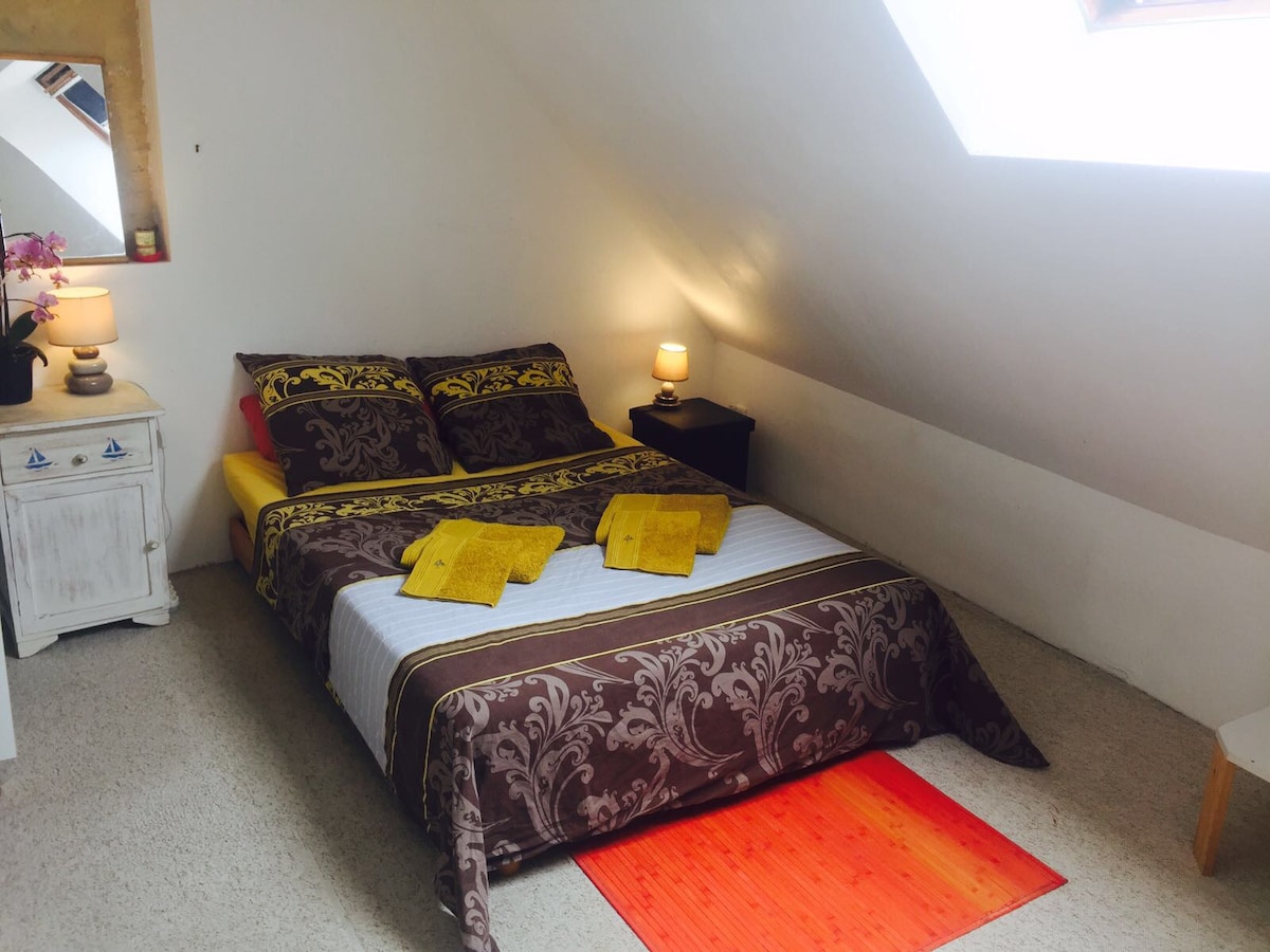 Grande chambre climatisé avec un lit double, un lit simple et un lit bébé. Une salle de bain avec baignoire et wc indépendant. Coin salon télé avec un lit simple en supplément de 20€ si besoin, le tout situé au premier étage d'une maison individuelle (étage réservé exclusivement aux voyageurs). Possibilité de petits déjeuners en supplément : 8euros/pers, servi à la table des hôtes. Repas possible sur demande. Stationnement facile dans la rue devant la maison.