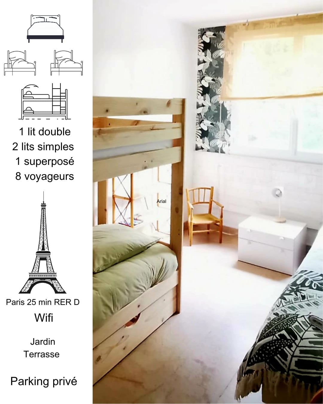 Bienvenue dans notre appartement se trouvant dans une résidence calme paisible et sécurisée. Vous pourrez y résider en toute tranquillité en famille, entre amis ou pour le travail et profiter de son grand jardin avec sa terrasse. Proche de toute commodités, vous pourrez vous rendre en 30min à Paris en transport (RER D et RER C) et accéder en 20min a l'aéroport de PARIS-ORLY en voiture. Pour le shopping, la zone de la croix blanche à 3km Nous avons hâte de vous y accueillir. Gaël et Jessy