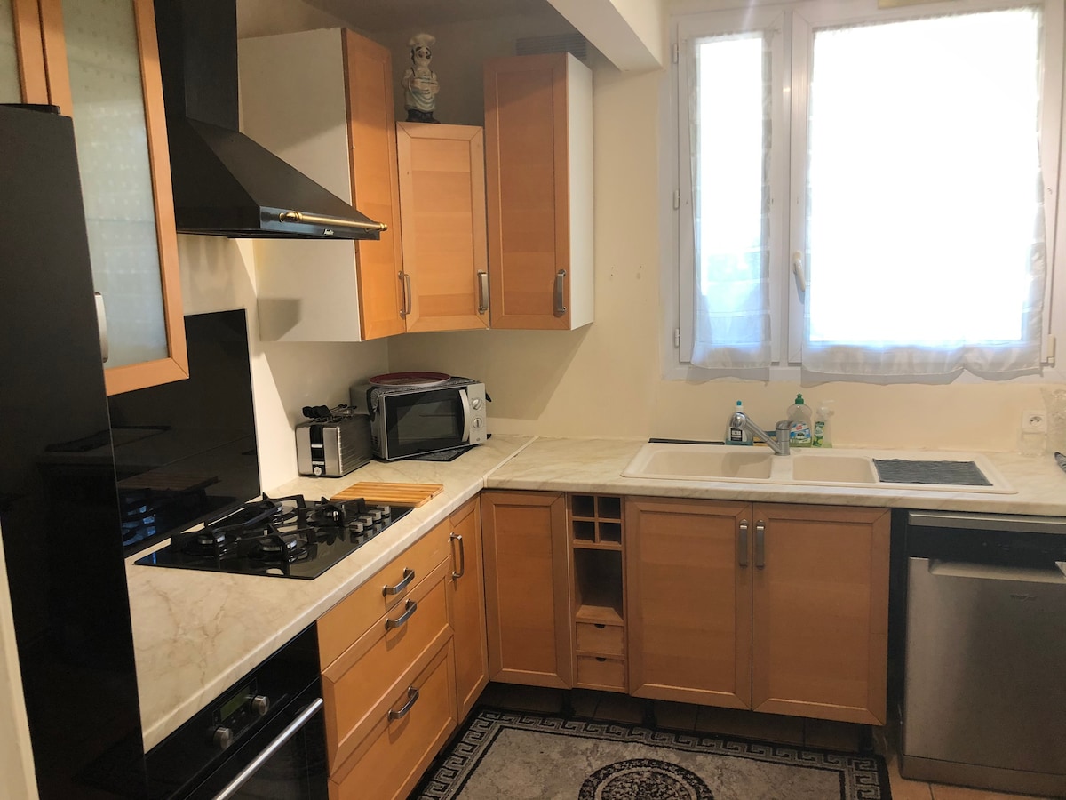 La gare d'Antony est à 300m, PARIS à 20 min en train !!!!, l'Aéroport d'Orly à 6min avec le Orlyval ! Tour Eiffel et Arc de Triomphe 35 min en trains, 15 min en train des Catacombes. Equipement : lit 140x190, table avec 2 chaises, TV, cuisine équipée ( plaque, hotte, réfrigérateur avec freezer, four combiné micro-onde...), machine à café avec dosette, thé, lave linge séchant, ventilateur de plafond, deffroisseur vêtement, sèche cheveux, wiffi,