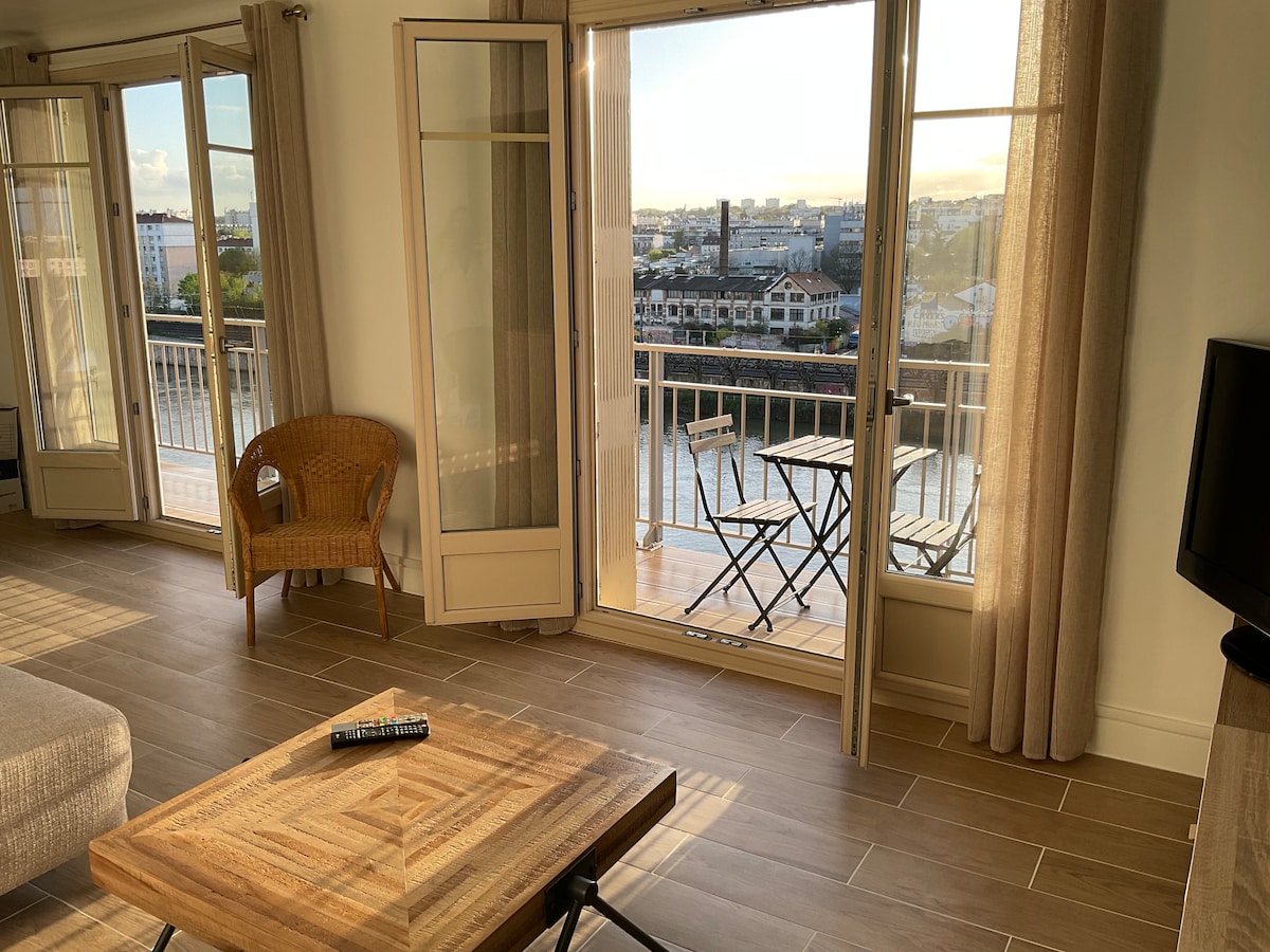 Joli appartement en Bord de Seine, pouvant accueillir 5 personnes. Vous serez séduit par le confort et la luminosité et profiter d'une grande terrasse. Idéal pour les vacances ou pour le travail. Avec une capacité de 5 couchages (dont lit pour un enfant), ce logement allie confort, espace et une vue exceptionnelle sur les quais de Seine. Un accès facile et rapide pour les transports publics pour Paris et tous les lieux à visiter ( Versailles , Disneyland Paris...)