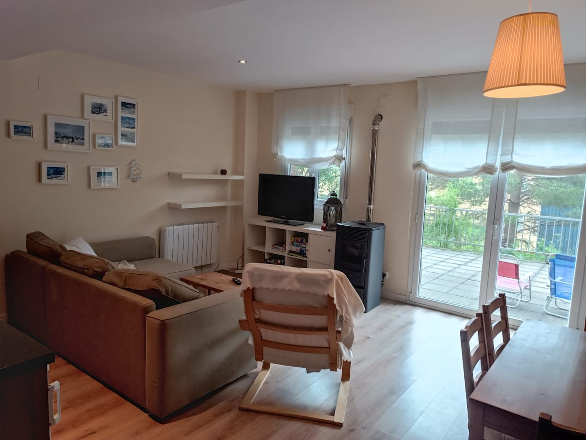 Cozy apartment in Canfranc Estación. 2 rooms. The main one with a large double bed and an additional extra bed, another room with 2 adult bunk beds and an additional adult bed. Bathroom with shower, living room with sofa bed and table for 8 people, dishwasher, washer-dryer, oven, microwave, etc. Storage room, garage and WIFI. Full equipped. You will have duvets, sheets and towels for everyone. Free bus to slopes 200 meters away and supermarket