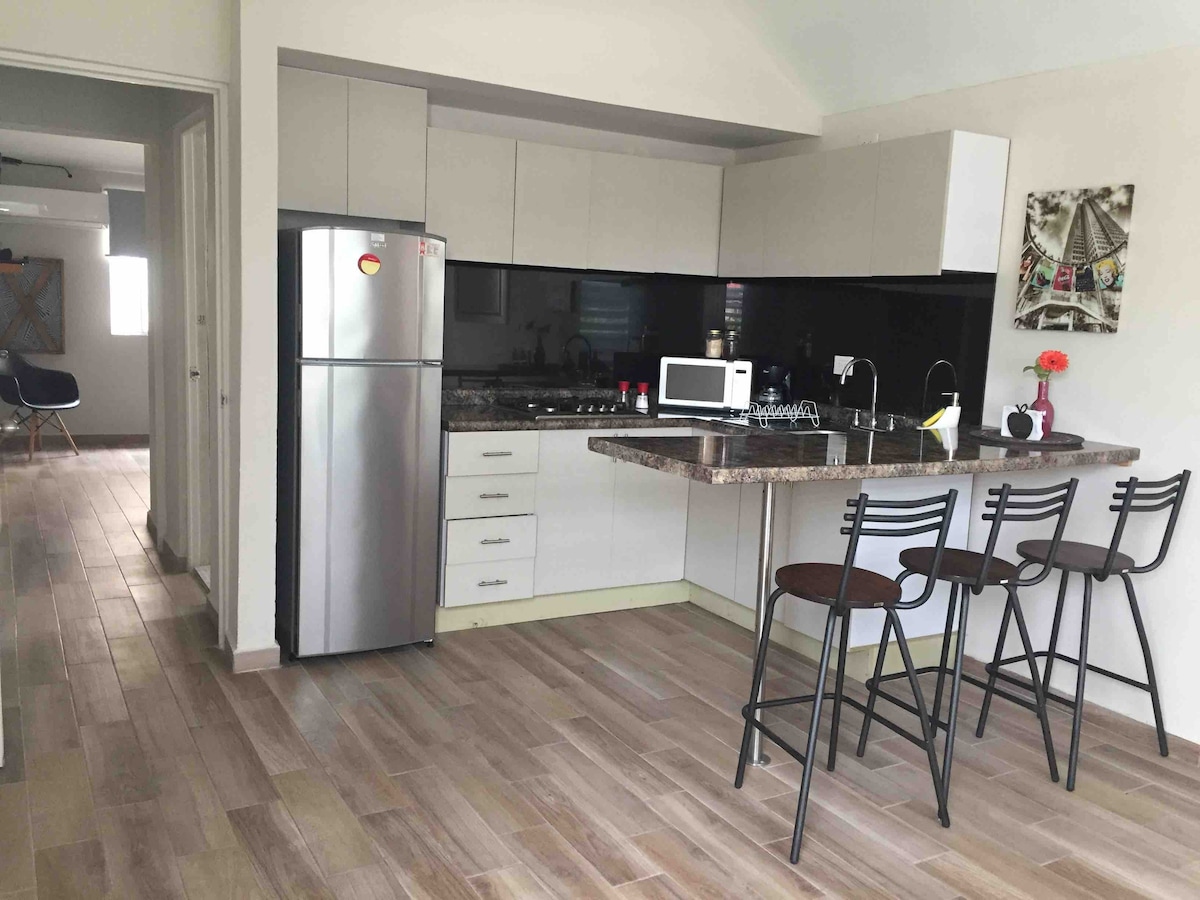 Departamento moderno en zona residencial con vista al cerro de la silla, el emblema de la ciudad de Monterrey. Comodidades como aire acondicionado, closeth, baño completo, televisión smart tv (Netflix), wifi y comedor con refrigerador y microondas. Excelente para descansar. Tranquilo a sus alrededores y estacionamiento.