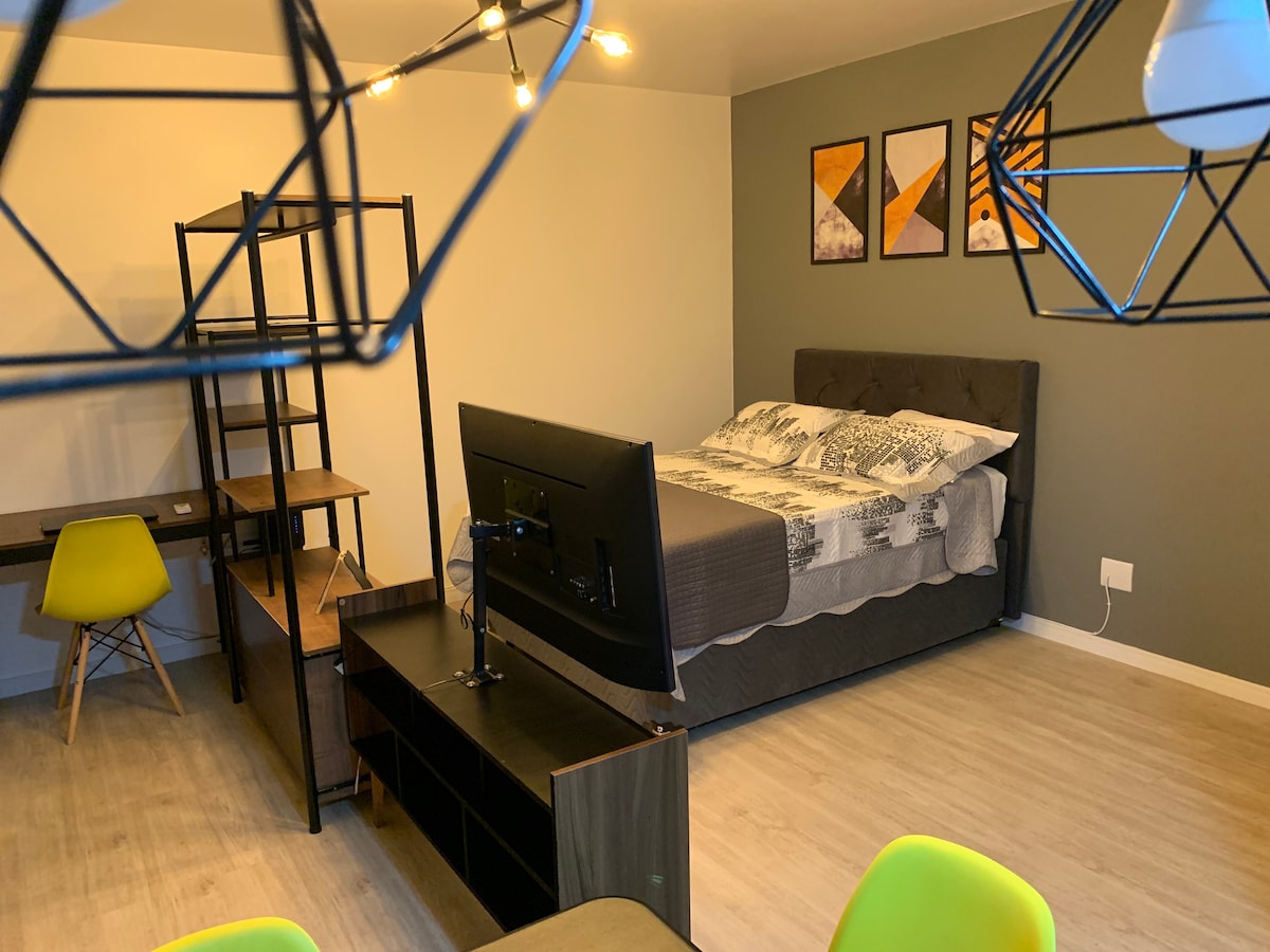 Awarded 70m2 LOFT in one of the most conceptual buildings in design in Porto Alegre, 8 minutes from the Iguatemi shopping mall. Decor inspired in Brooklyn 60's , NYC, fully furnished and ULTRA equipped, with ambient sound via amazon Alexa & various voice-controlled lighting scenarios, ultra fast fiber optic Internet (600mbps), work-station space, full kitchen, hydro for 2 people and a large infra. An experience for demanding people who seek to be surprised.
