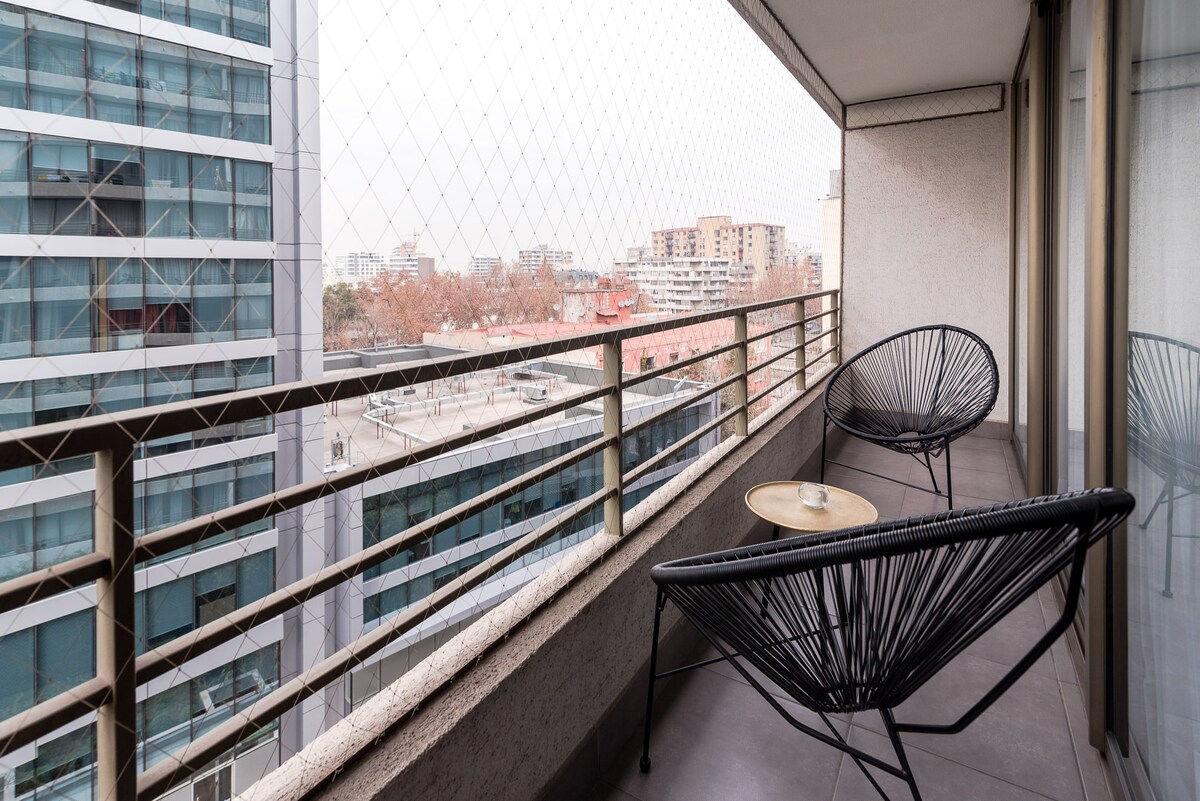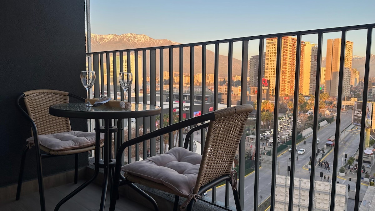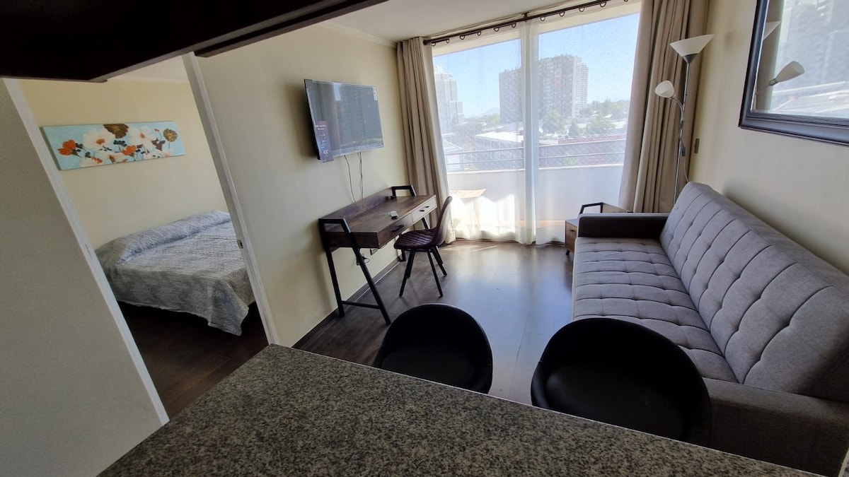 Moderno depto. con hermosa vista cordillera Ubicado en sector céntrico y tranquilo, a 500 mts del metro Bellavista, 700 mts del Mall Plaza Vespucio, 800 mts de Clínica Dávila, 20 min del aeropuerto, 10 min del Estadio Bicentenario y 7 min del Estadio monumental. 1 habitación + sofá cama en el living Cocina equipada Baño privado Balcón con vista a la cordillera WiFi y TV con aplicaciones Completamente equipado Moderno, cómodo y minimalista Piscina, gimnasio, quincho, co-work y salón de eventos