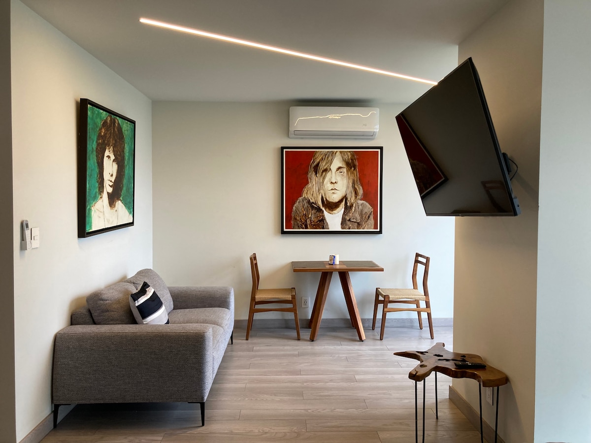 Decorated for personal use, this space combines a cozy, modern style with a touch of rock n' roll. It offers comfort, privacy, luxury, and tranquility. Located in the Golden Zone, in the heart of Tijuana, it's steps from the Xolos Stadium, the Caliente Casino, and a wide variety of shops, restaurants, and supermarkets. This space is ideal for business trips, leisure, and medical tourism (for 2 people, with a limit of 3). Now you can also enjoy the pool!