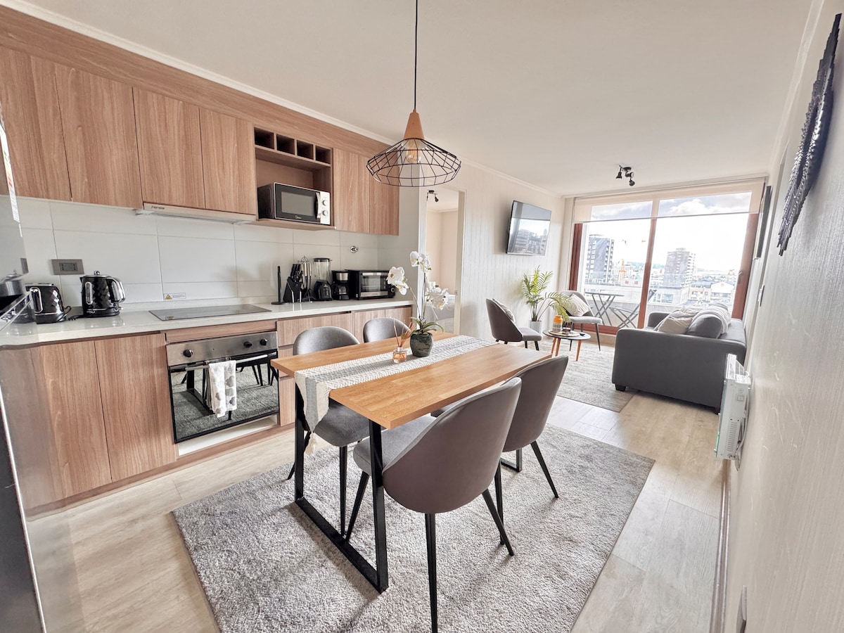 Departamento totalmente equipado, ideal para turistas que buscan comodidad y excelente ubicación. A minutos del aeropuerto, terminales y centros comerciales. Cocina full equipada para preparar lo que desees. Baño con toallas, jabón y shampoo. Conexión WiFi disponible. Entregamos recomendaciones locales y rutas turísticas. Estacionamiento (altura máx. 2,10 m). Ofrecemos traslados en van para conocer Concepción y la región de forma segura y eficiente.