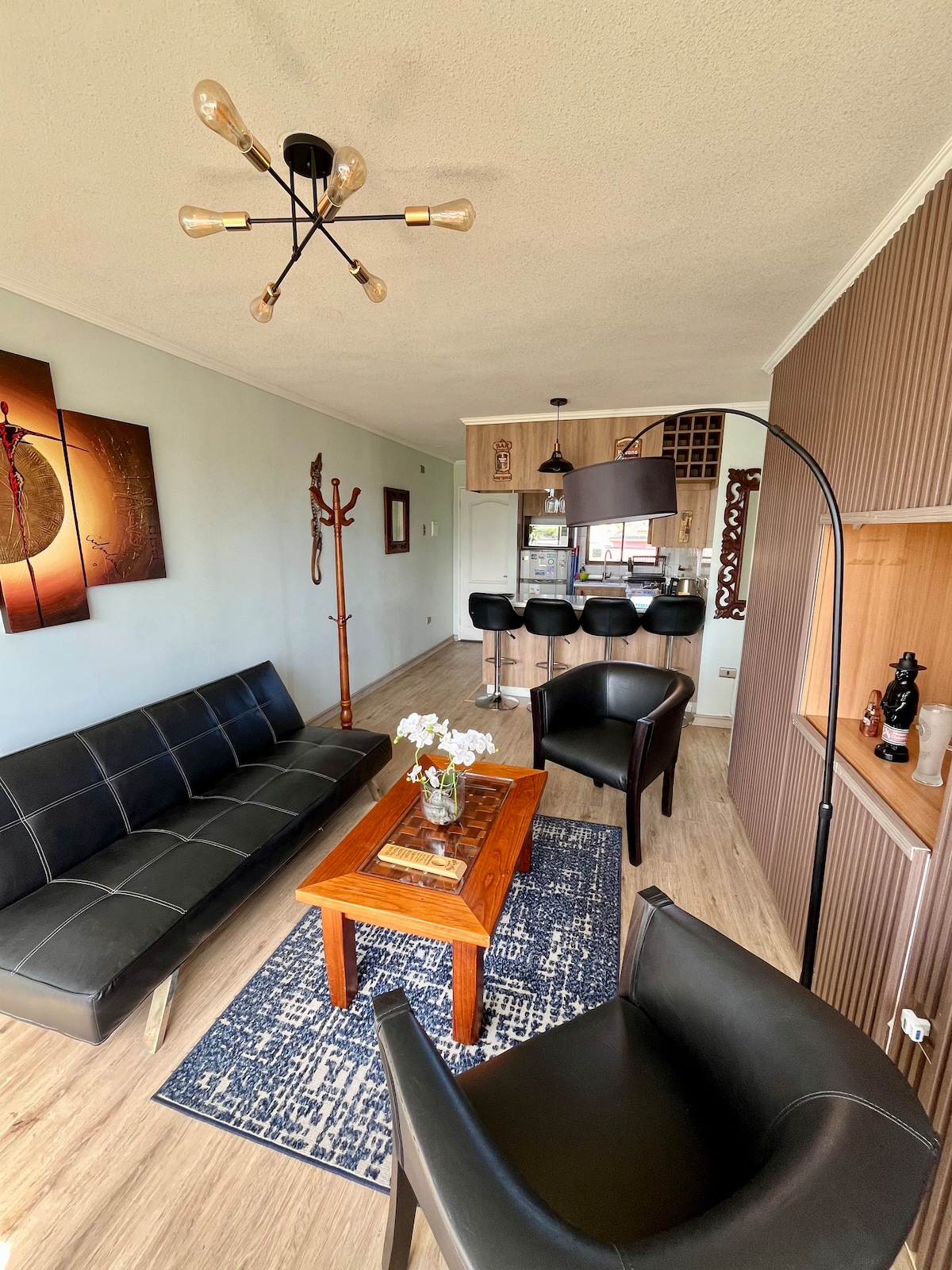 Acogedor departamento 2 dormitorios con estacionamiento. Dormitorio principal cuenta con comoda cama King y el segundo dormitorio con una cama de plaza y media, opcionalmente se dispone de ropa de cama para un cuarto huésped. Departamento con área de trabajo, lavadora con secadora, cocina a gas y estacionamiento. Ubicado en sector Brisas del Sol a pasos del Casino Marina del Sol y centro de convención espacio marina, muy cerca del Mall del trebol y Sur activo.