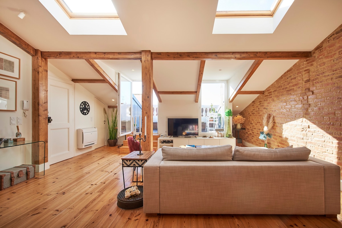 Embrance yourself in the most beautiful and cool Penthouse of the city, with a great terrace and perfectly located in the center of Lisbon, by the river. An unique 3 bedroom apt full of light, carefully renovated, with a modern design keeping beautiful historical details (with AC & lift). In Lisbon's most charismatics neighbourhoods, Bica and trendy Cais do Sodré, where you'll find all kind of restaurants, bars, shops...Perfect place for your holidays which allows you to explore Lisbon by foot!