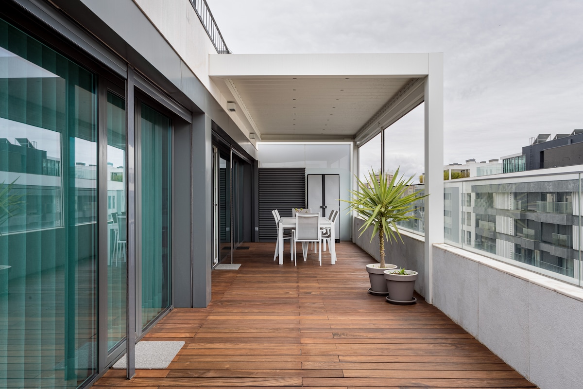 Apartamento reconstruído por arquitecto, excelente privacidade, exposição solar, com wifi, e praia a 150m. 1 suite com SPA e banho turco com aromaterapia. 1 suíte com terraço com vista mar, tela de projeção de cinema. Sala com vista de mar, rio, e terraço, onde poderá disfrutar de uma zona de estar e de um barbecue com grelha em ferro forjado. Perto de restaurantes, cafés e supermercado, e estação de comboio. Ar condicionado e piso aquecido em todas as áreas, TV 4K e box independente por suíte.