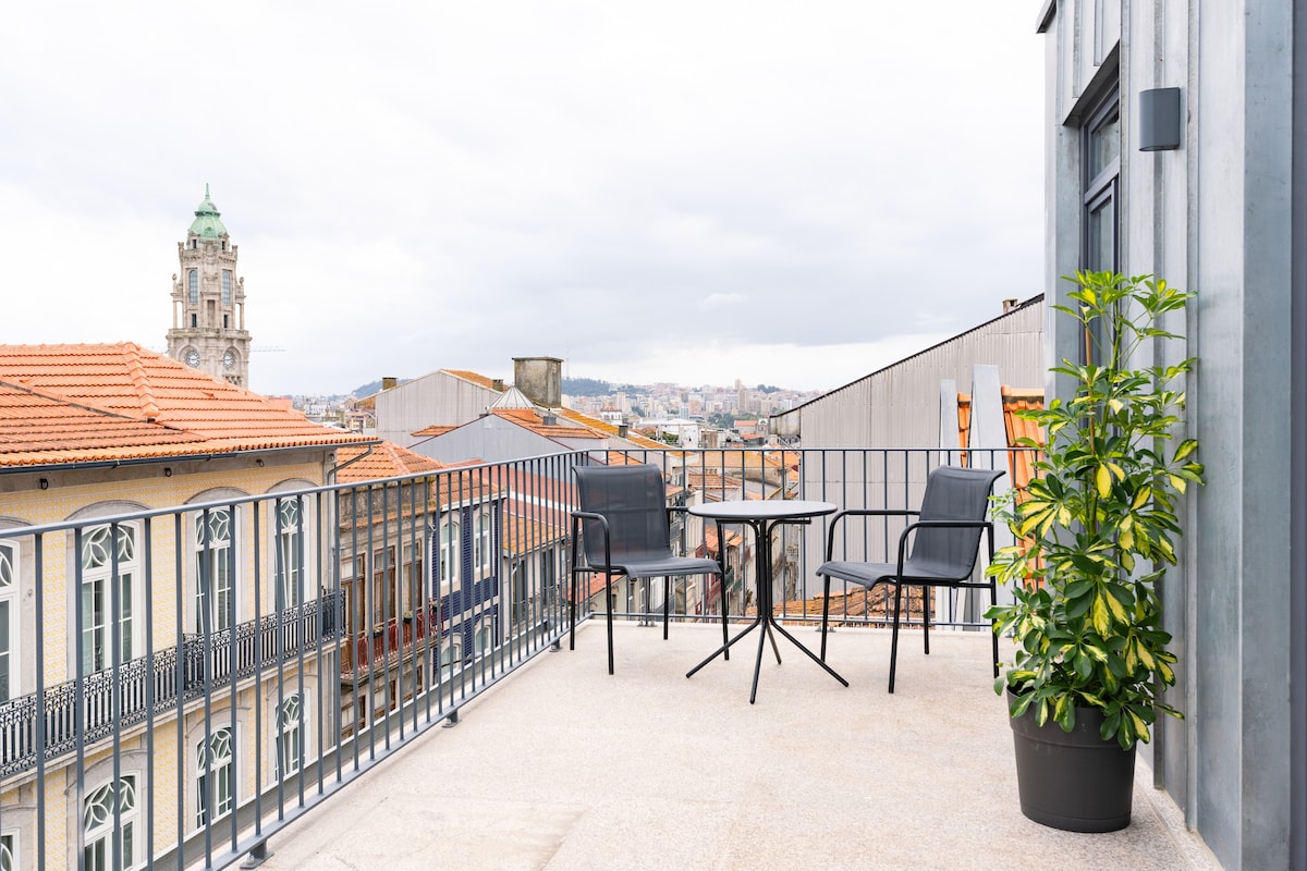 The Alves da Veiga Rooftop is located in downtown Porto, just 2min away from Mercado do Bolhão. It’s a 200sqm loft with 2 bedrooms (one upstairs and one downstairs), 2 bathrooms (both downstairs), a spacious terrace and 2 balconies. It's full of light and space for up to 4 people. You can park your car in our private parking space and take the elevator to the rooftop. The spacious terrace is ideal to relax after a long day and enjoy a bottle of wine while overlooking the Downtown skyline!