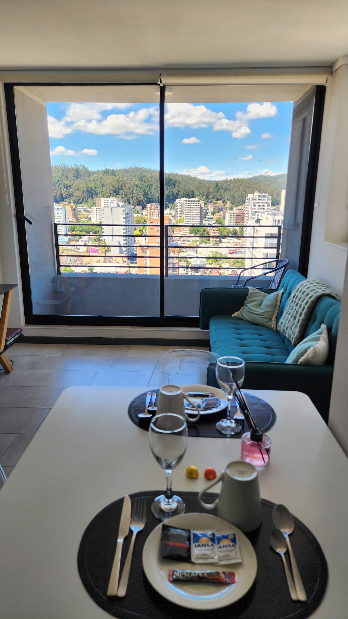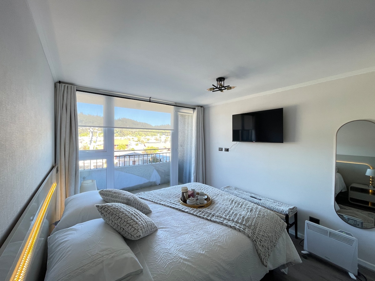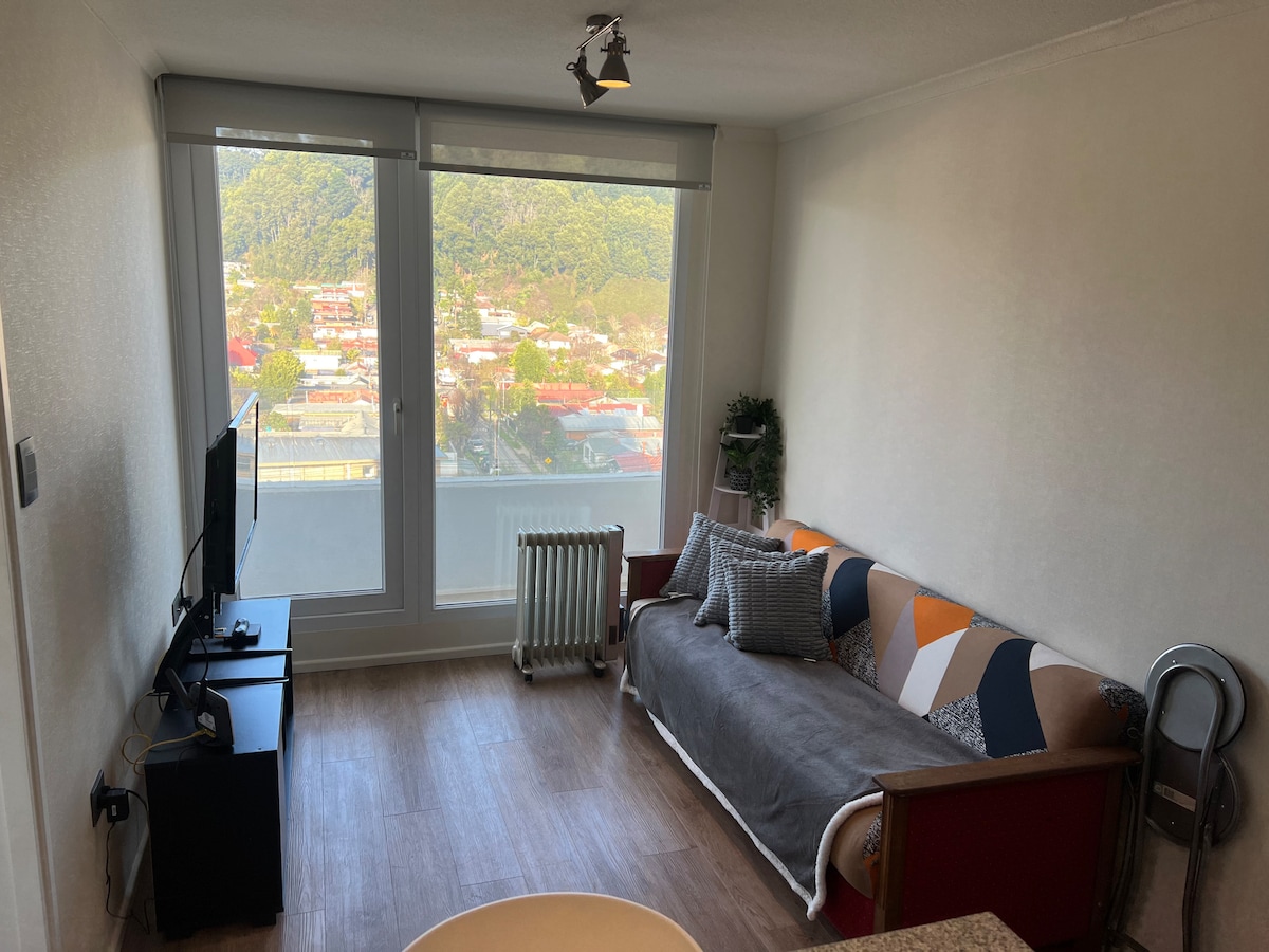 Modern 1-bedroom apartment on the 15th floor with panoramic views of Concepción and unique sunsets 🌇. Bright and cozy space, ideal for relaxing, working, or long stays. Features a comfortable living room 🛋️, fully equipped kitchen 👩🍳, fast Wi-Fi 🛜, TV with Netflix/Disney+ 📺, and a double bed 🛏️. Centrally located, just steps from downtown, universities, restaurants, and public transport 🚍. 🔔 Automatic discounts from 2 nights 😌
