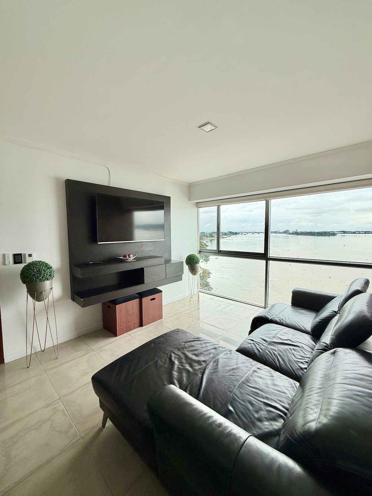 Modern suite in Riverfront 2 – Puerto Santa Ana, with river views, ideal for leisure or business trips. Features a very comfortable King-size bed and a sofa bed in a modern, bright space. Includes Smart TV 55” in the living room and 40” in the bedroom, Netlife Wi-Fi, air conditioning, fully equipped kitchen, washer, and 24/7 security. 🏊💪 Pool and gym available according to building hours. 🚗 Parking included at Santana Park, across the street. Located next to Wyndham Garden Hotel.