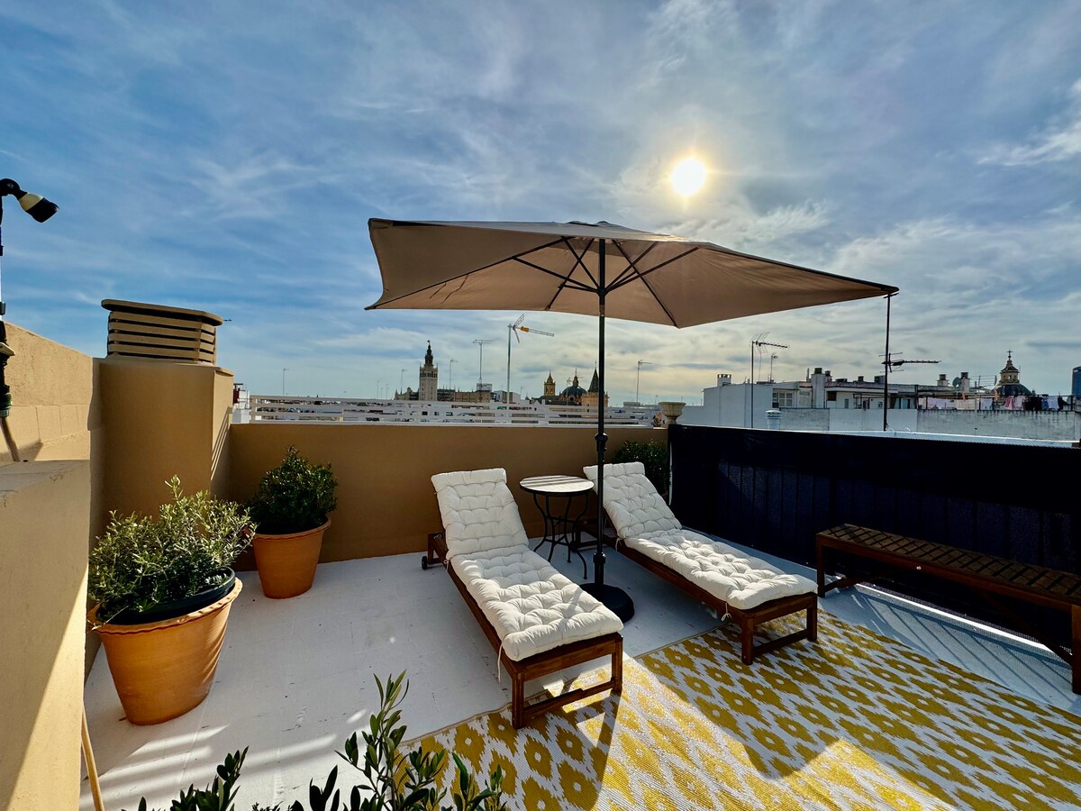 Magnificent penthouse in a recently built building with the highest quality finishes, with two private terraces with privileged views of the Cathedral. Located in the heart of Seville, just a few meters from the Cathedral, Giralda, and the rest of the city's monuments. The apartment is a very spacious studio with a queen-size bed, a living-dining room, a terrace with an outdoor dining area, and another terrace with a sofa, shower, and sun loungers. The views are unbeatable.
