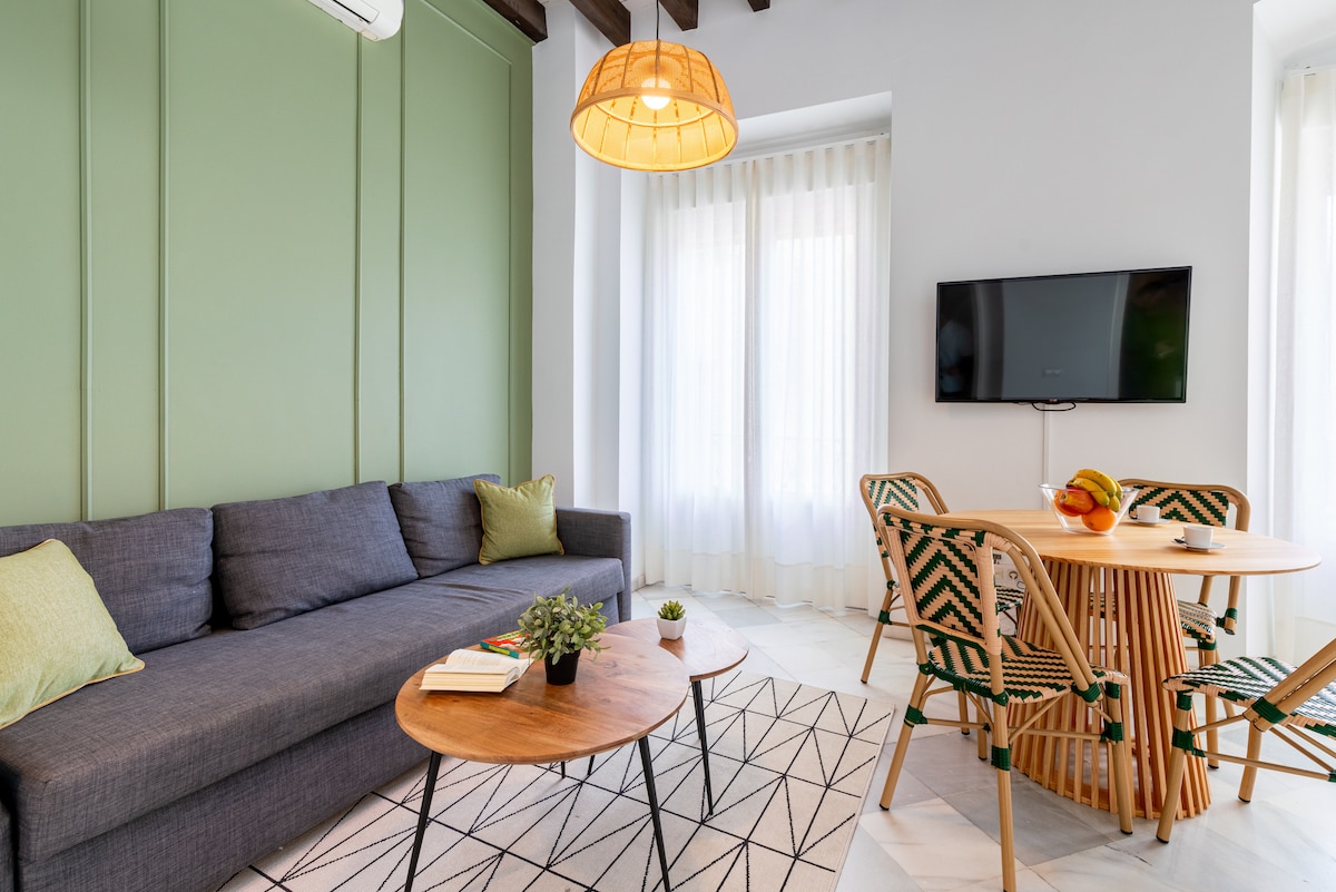 Situado en una animada calle del barrio de Santa Catalina, este apartamento de un dormitorio y salón con sofá cama, ofrece un diseño vintage con lujosos detalles. Cuenta con un espléndido balcón exterior y un patio interior que bañan las estancias con el sol de Sevilla. Tu anfitrión estará físicamente en la propiedad y disponible para cualquier cosa que necesites durante tu estancia. El barrio de Santa Catalina es un barrio popular del centro de Sevilla. Se encuentra a 2 minutos a pie de Las Setas y a 5 minutos de la zona de moda en la calle Feria. En escasos 10 minutos se llega al entorno de la Catedral y el Alcázar. Disponible servicio Netflix