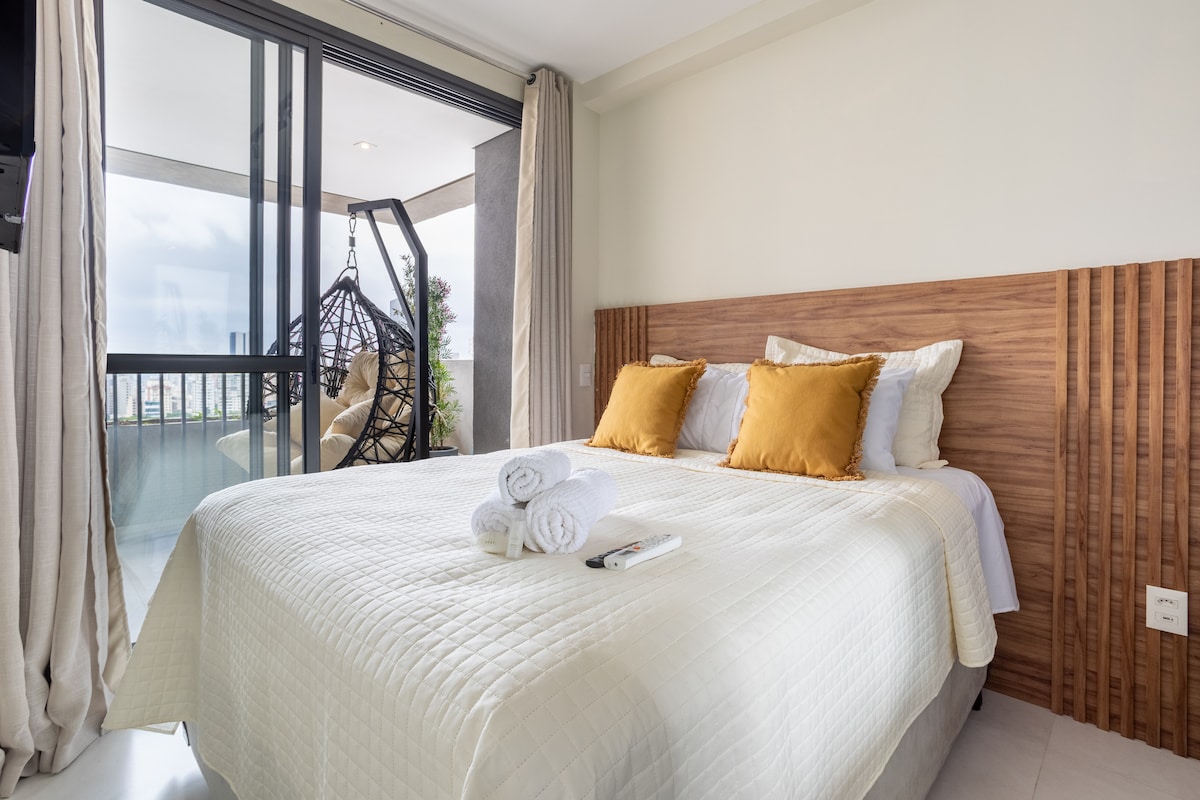 Cama Queen, ar-condicionado, TV Smart 43”, Internet fibra, 1 vaga garagem, academia e piscina. Pertinho da Avenida Paulista e com acesso fácil ao Metrô. Horários de check-in e de checkout flexíveis! Consulte disponibilidade. :) Excelente para home office: duas redes independentes de Internet - Vivo e Claro, ambas com 300 Mb. Limpeza e arrumação diária do apartamento. Estadias longas (10+ dias) troca de roupa de cama e banho incluídas.