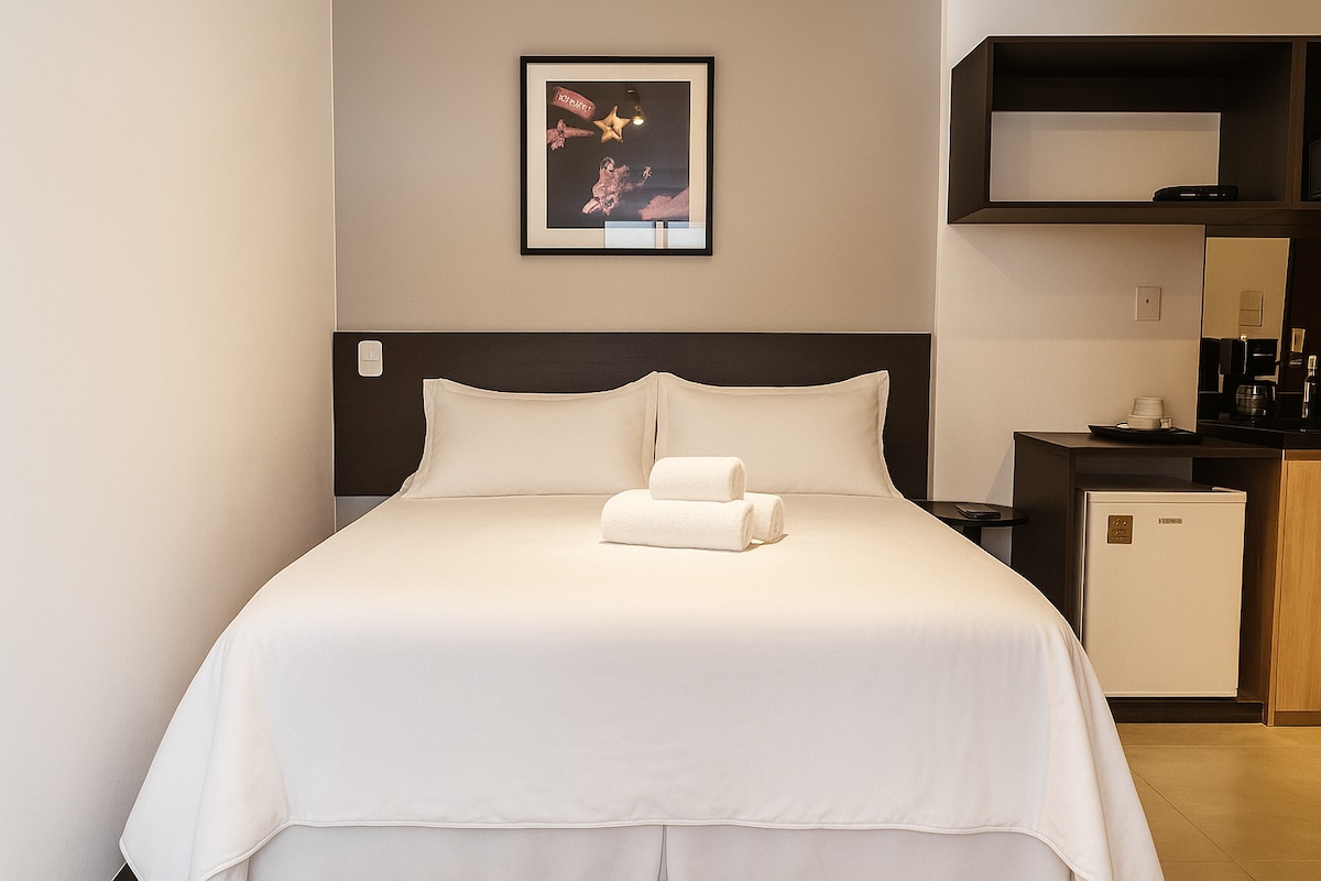Studio completo e aconchegante onde você irá encontrar tudo para o seu conforto! O studio oferece: • Cama queen e um sofá espaçoso • Ar condicionado e aquecedor • Toalhas e roupas de cama • Utensílios de cozinha O prédio também conta com piscina de borda infinita no 20o andar, academia, sauna, garagem e um mini mercado Aqui tem tudo o que você precisa para trabalhar e/ou relaxar com uma vista maravilhosa de SP