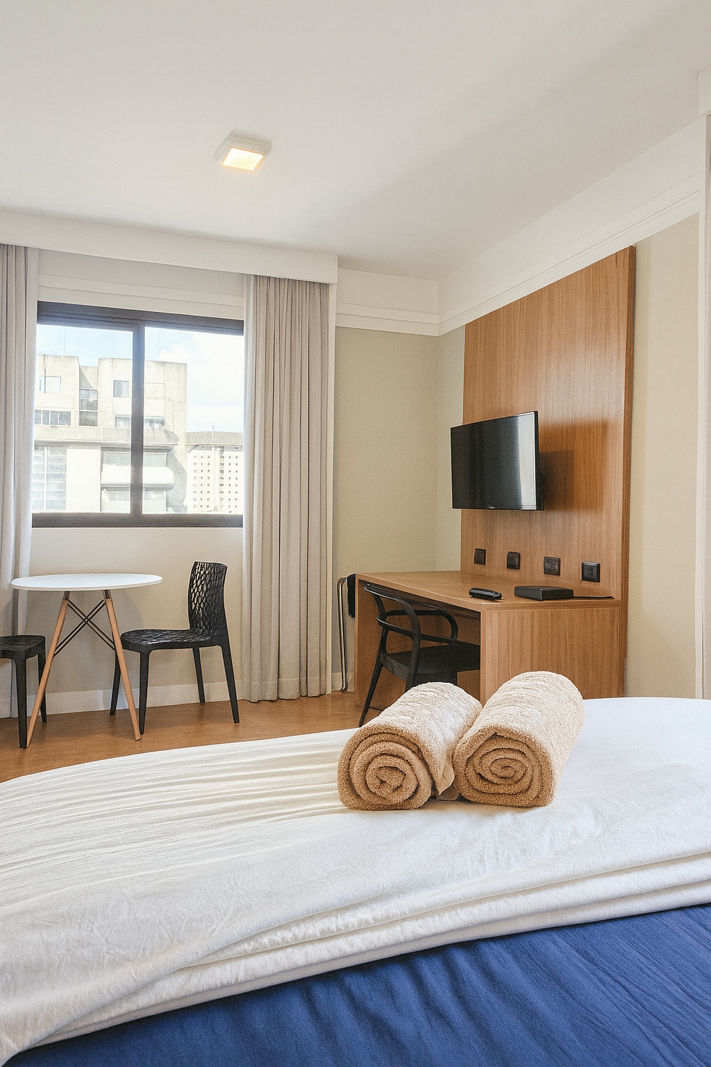 Modern flat in a 4★ hotel in Jardins with the comfort of BOOK A FLAT! ✅ One block from Paulista Ave. and Consolação station ✅ Suite with equipped kitchenette, Wi‑Fi and air conditioning ✅ Private bathroom, minibar and daily cleaning ✅ On‑site restaurant, bar and breakfast (extra) ✅ Pool, sauna and 24h reception ✨ Perfect for business or leisure – enjoy SP with BOOK A FLAT!