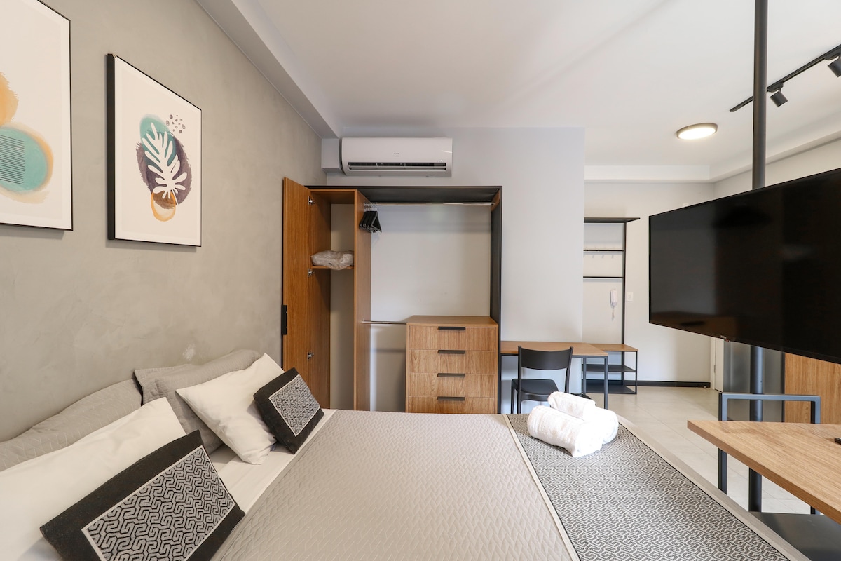 A unique space. Have a true Paulistana experience! Flat with 44m2, 1 bedroom with double bed (noise-resistant window), living room with 65p TV, Wifi, kitchen, new and renovated apartment, balcony, free parking, close to several shopping centers, convenience stores, fantastic restaurantes, in the coolest and most famous neighborhood of São Paulo, close to Subway (400 meters) , beautiful view of Av Paulista. Accommodates up to 3 people (1p in the living room sofa-bed). 24h reception desk.