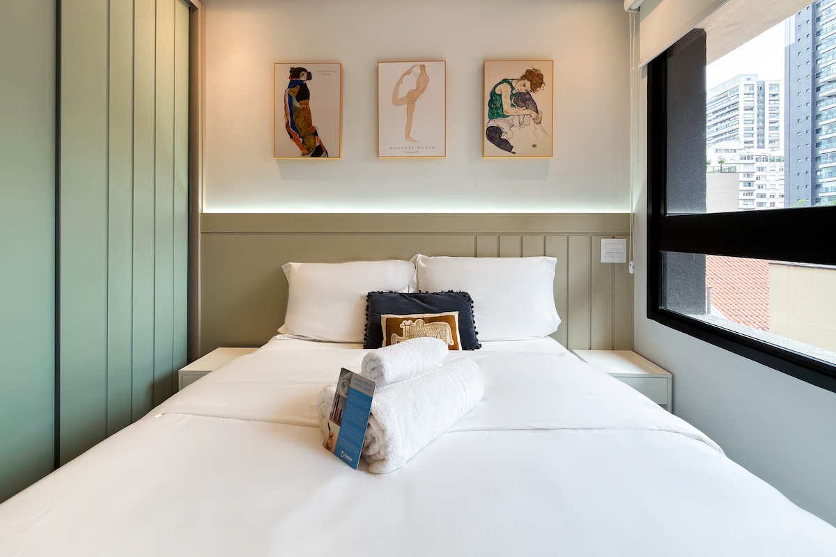 Studio novo e aconchegante no coração de São Paulo, prédio recém entregue com tudo novo! Cama de casal, cortina blackout, secador de cabelo, airfryer, panela de arroz, máquina de café e todos os utensílios necessários para uma ótima e confortável hospedagem. Prédio super bem localizado, 5min a pé da Avenida Paulista/ muito próximo aos metrôs da Avenida Paulista e Consolação. Pets são muito bem-vindos :)