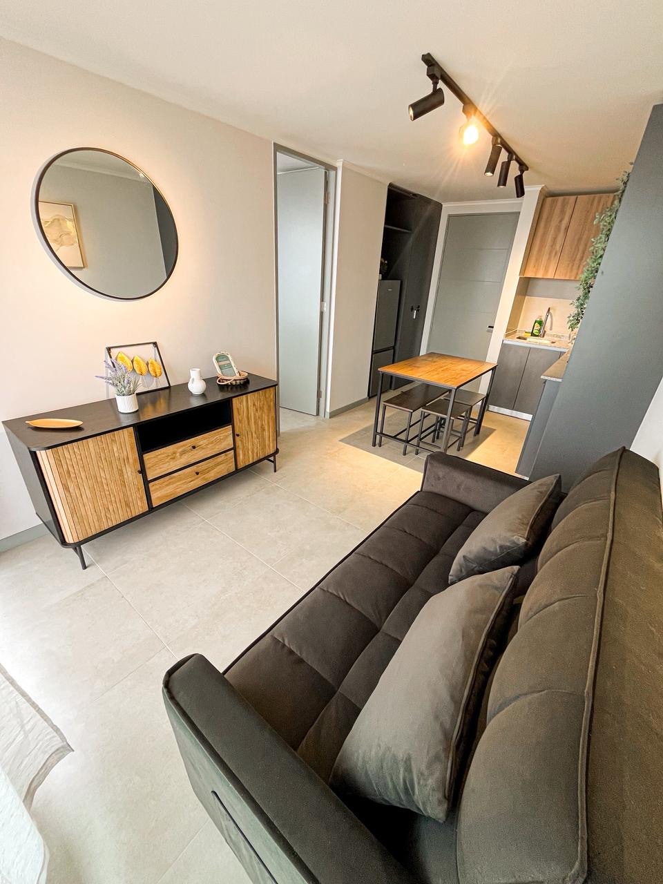 Disfruta tu estadía con estilo y comodidad 4 personas. Lo que encontrarás: A/C Frío/Calor 1 Hab con Cama King 1 Sofá Cama king 1 baño completo con shampoo, acondicionador, jabón corporal y secador de pelo Cocina equipada: cafetera, microondas, tostador, hervidor y horno. Ideal para preparar tus comidas favoritas. Zona de trabajo, WiFi y escritorio, perfecto para viajeros remotos Lavadora/Secadora dentro del depto, para mayor comodidad. Estacionamiento privado y gratuito Piscina Gym Quincho