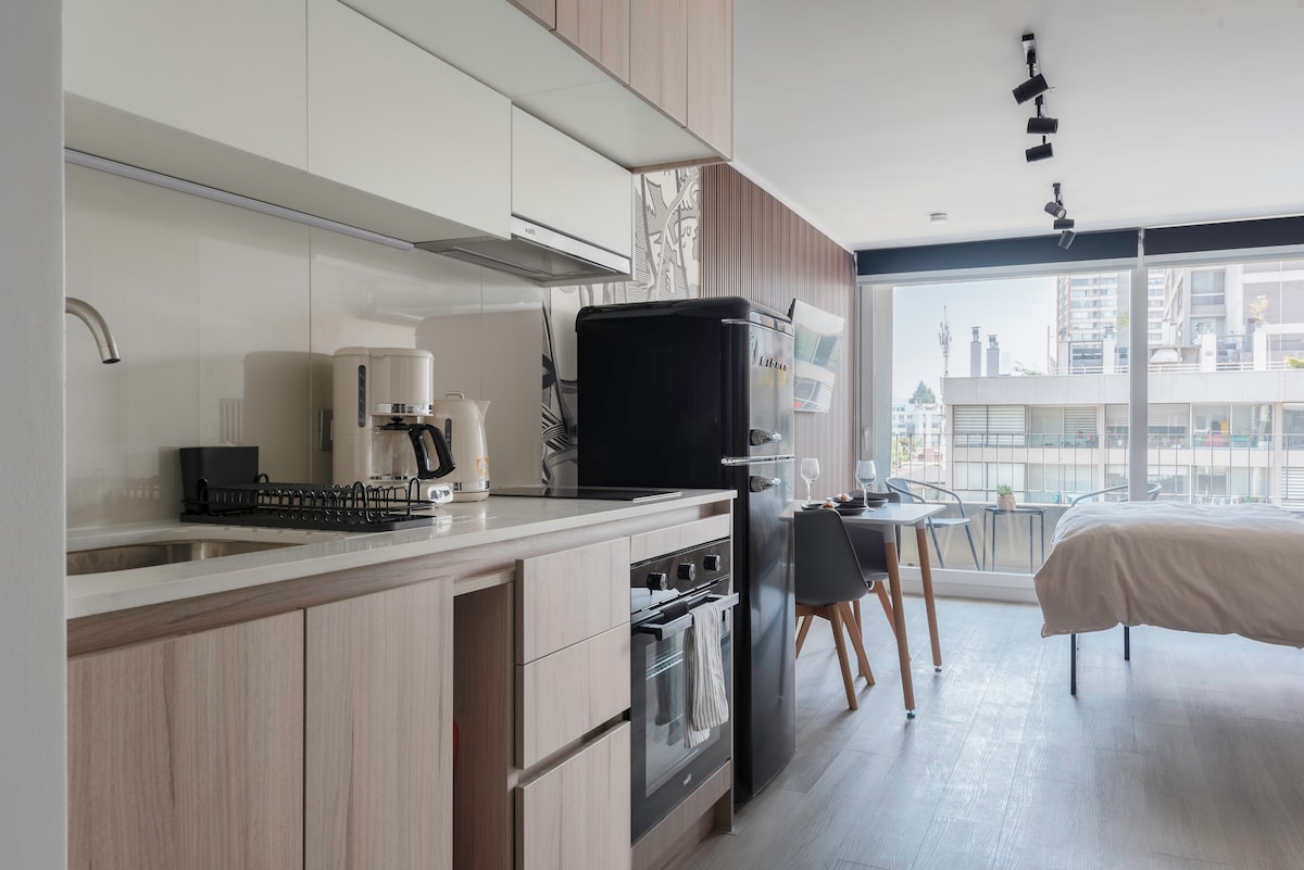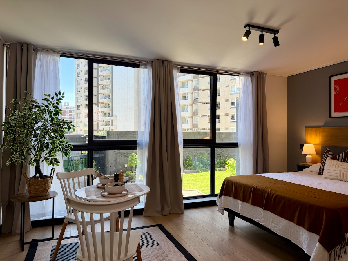 ✨ Estudio Lujoso en Ñuñoa con diseño moderno y gran luminosidad. 🚆 A 3 min de Metro Ñuñoa (L3 y L6), 15 min del Estadio Nacional y 5 min de Providencia y Barrio Italia. Parada de bus frente al edificio. 🛒 Rodeado de cafés, restaurantes, supermercados y farmacias. 🏡 Perfecto para viajes de negocios, escapadas románticas o estadías largas con estilo.