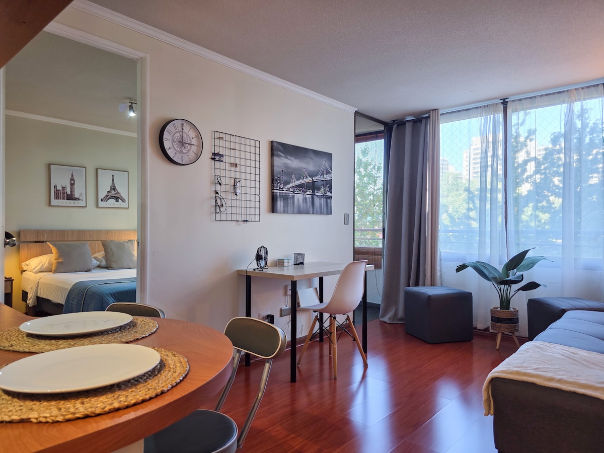 ¡Disfruta de una estancia inolvidable en nuestro hermoso departamento! Totalmente equipado, con Wi-Fi (perfecto para teletrabajo), cocina full equipada, habitación acogedora y estacionamiento privado dentro de las instalaciones. 📍 Ubicación: A 8 minutos caminando del metro Ñuble (línea 5 y línea 6). 🛏️ Capacidad: Hasta 2 personas ✨ Servicios: Wi-Fi, televisión, Netflix, ropa de cama, toallas, utensilios de cocina y más. ¡Tu hogar lejos de casa te espera!
