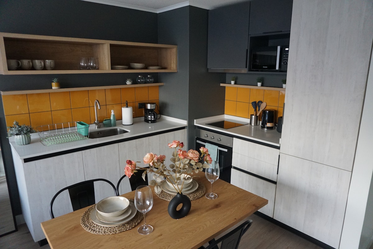Disfruta de un departamento moderno, luminoso y cuidadosamente decorado. Totalmente equipado para estadías cómodas, cuenta con cama de dos plazas, sofá cama, cocina integrada, Smart TV, WiFi y balcón con vista despejada. Ubicado en zona segura y conectada de Santiago, ideal para descansar o trabajar. Espacio cálido, funcional y pensado en cada detalle para que te sientas como en casa. Excelente ubicación: cercano a Plaza Ñuñoa y Mall Portal Ñuñoa, centros deportivos. Con buena locomoción.