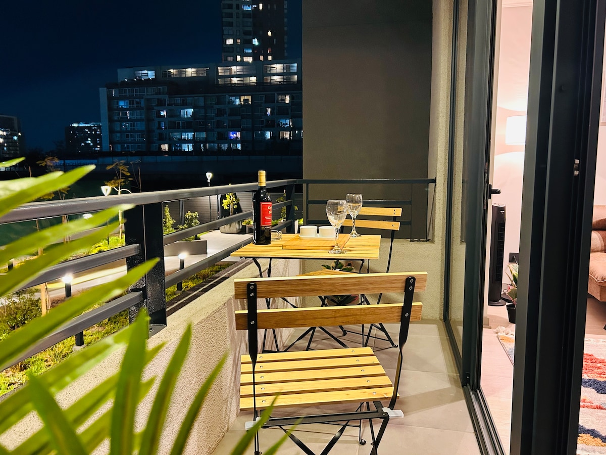 Disfruta de la sencillez de este alojamiento tranquilo y céntrico.Disfruta una estadía moderna en un edificio nuevo en el corazón de Ñuñoa, al lado del Parque Bustamante y a pasos del Metro Irarrázabal . Cuenta con: 1 Dormitorio con cama doble y sofá cama. 2 Cocina full equipada con cafetera Nespresso 3 Baño con tina y amenities. 4 Smart TV con Netflix. 5 WiFi flash de 600 Mbps. 6 Refrigerador moderno. 7 Ropa de cama premium. Fumar solo en terraza (Ley 20.660).
