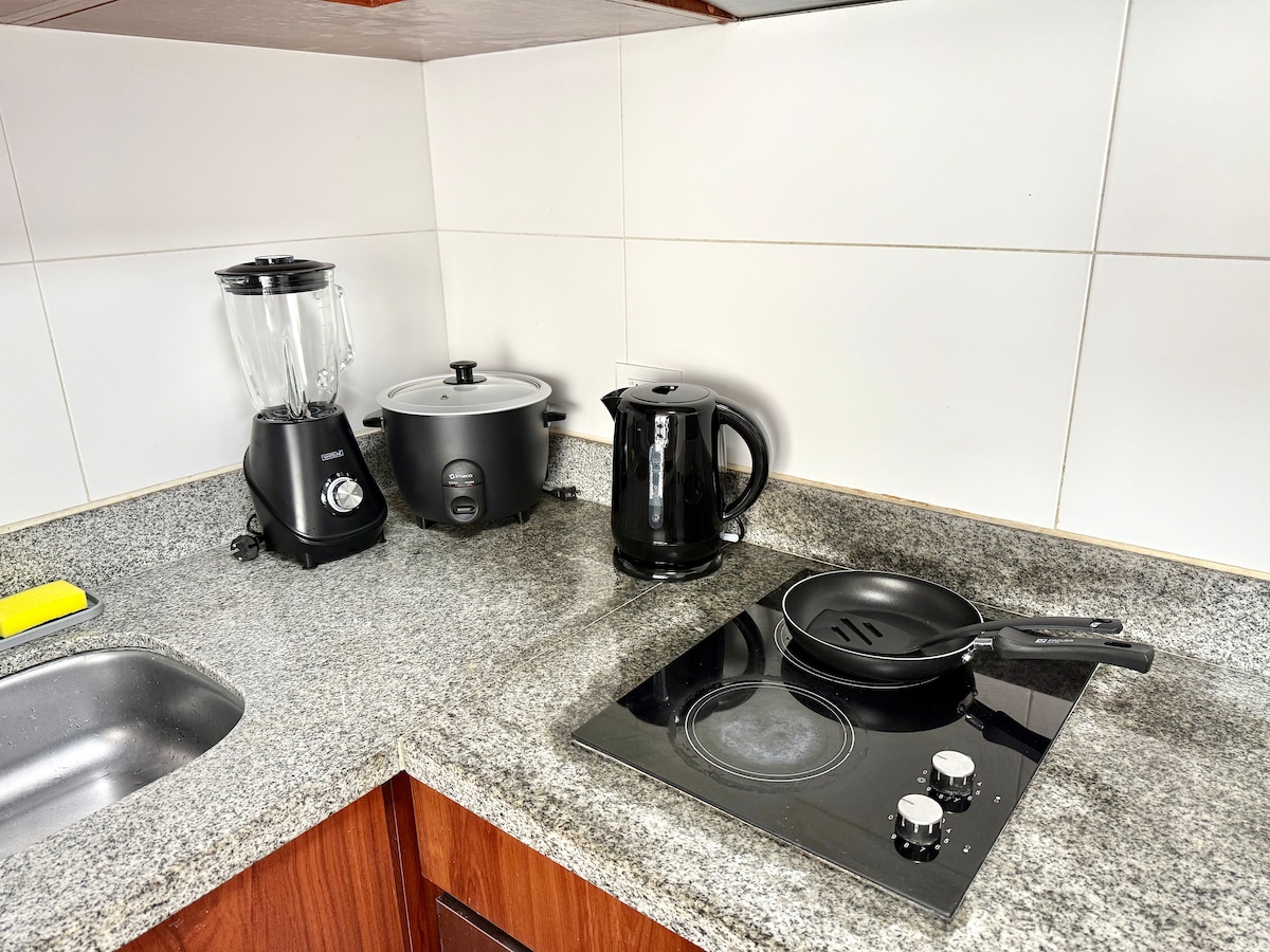 • Departamento PRIVADO • Cerca del aeropuerto (15 min aprox) • 1 Baño con agua caliente y shampoo • Traslados al aeropuerto (costo extra) • Restaurantes a 5 minutos a pie • Desayuno de 7am a 10am (costo extra) • Tenemos snacks/bebidas/souvenirs • Sala y TV con Netflix listo para usar. • Cocina con varios electrodomesticos