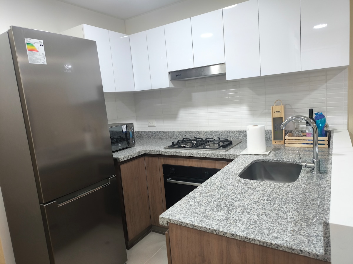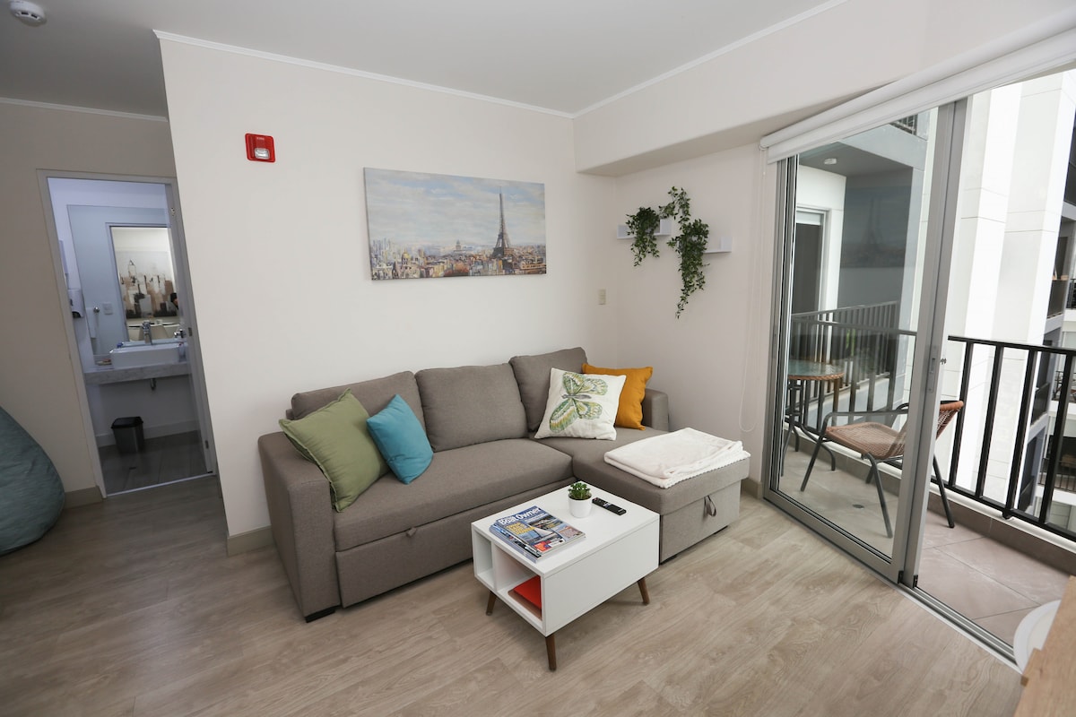 Super well located in MIraflores. Ideal for long stays and working nomads. Beautiful and quiet neighborhood. 1 block from boardwalk and best foodie street in Lima. Cozy, warm, modern, comfortable and very bright. Excellent Wifi! Fully equipped kitchen. Exterior sights and ocean view. Concierge 24hrs. A step away from bars, restaurants, malls, markets, cinemas, galleries and theaters. Beautiful parks with sea sights and outdoor activities. Walking distance from the coolest spots of Miraflores.