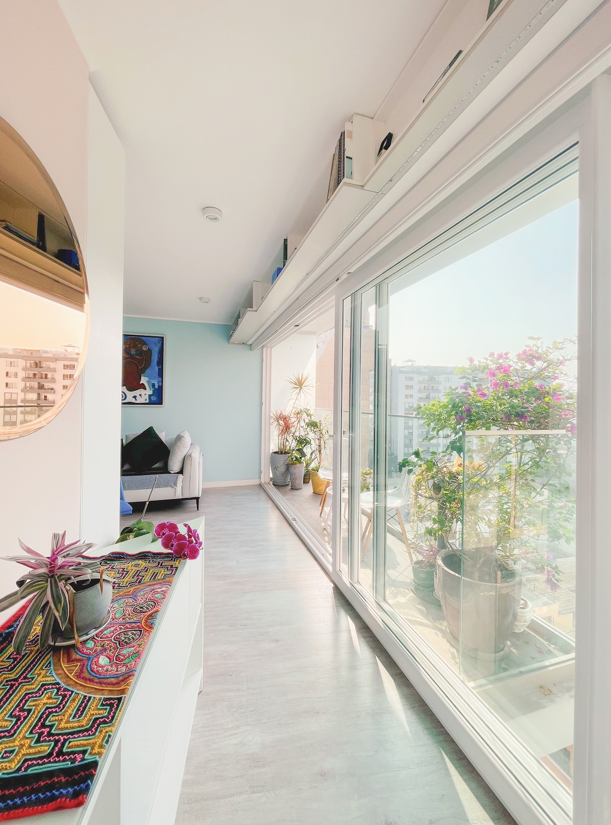 Super well located in MIraflores. Ideal for long stays and working nomads. Beautiful and quiet neighborhood. 1 block from boardwalk and best foodie street in Lima. Cozy, warm, modern, comfortable and very bright. Excellent Wifi! Fully equipped kitchen. Exterior sights and ocean view. Concierge 24hrs. A step away from bars, restaurants, malls, markets, cinemas, galleries and theaters. Beautiful parks with sea sights and outdoor activities. Walking distance from the coolest spots of Miraflores.