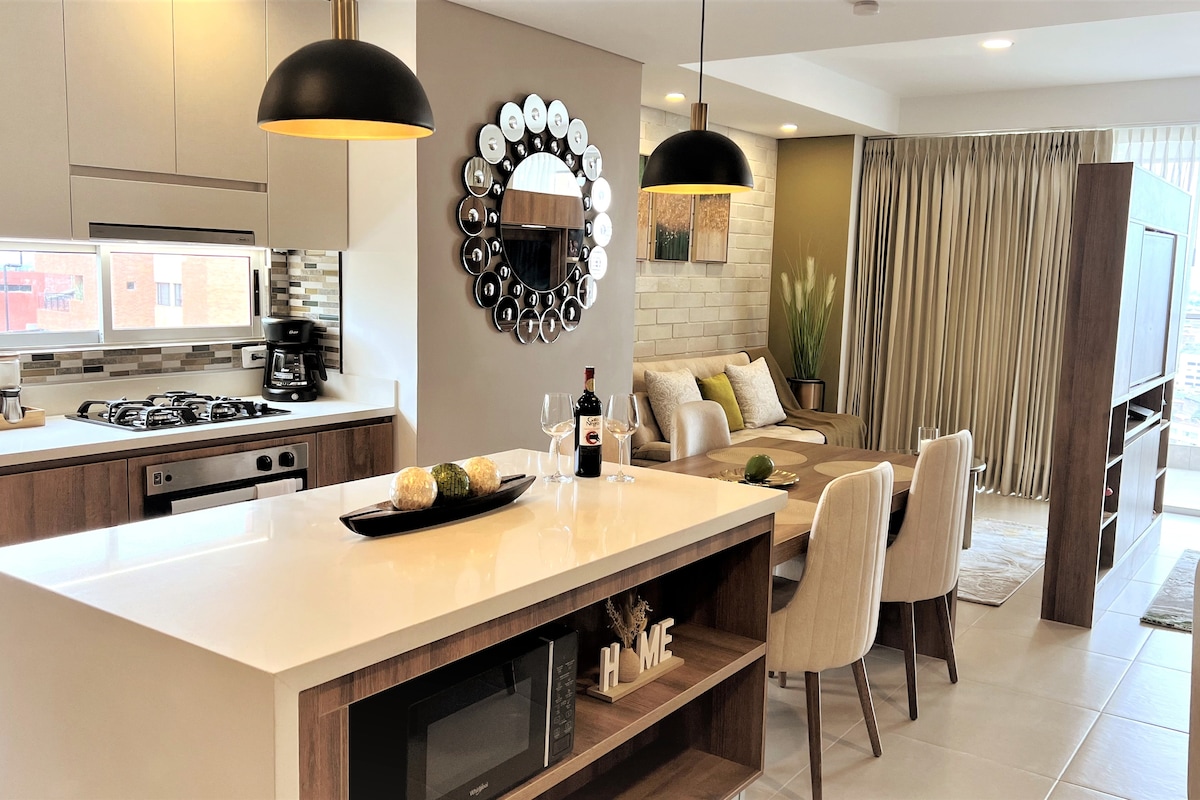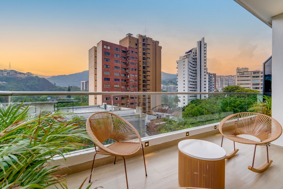 Luxurious Suite-type corner Apartment on the 7th floor, large balcony with Amazing views of the city and the mountains. Located in the exclusive area of ​​Granada, surrounded by restaurants with the best gastronomic offer in the City, fashion boutiques, bars and cafes. A few meters from CC Centenario, Bulevar del Rio, Gato Tejada, 5 minutes from CC Chipichape, only 30 minutes from the Airport. Building equipped with swimming pool, Jacuzzi, gym, steam room, yoga area, Coworking Space.