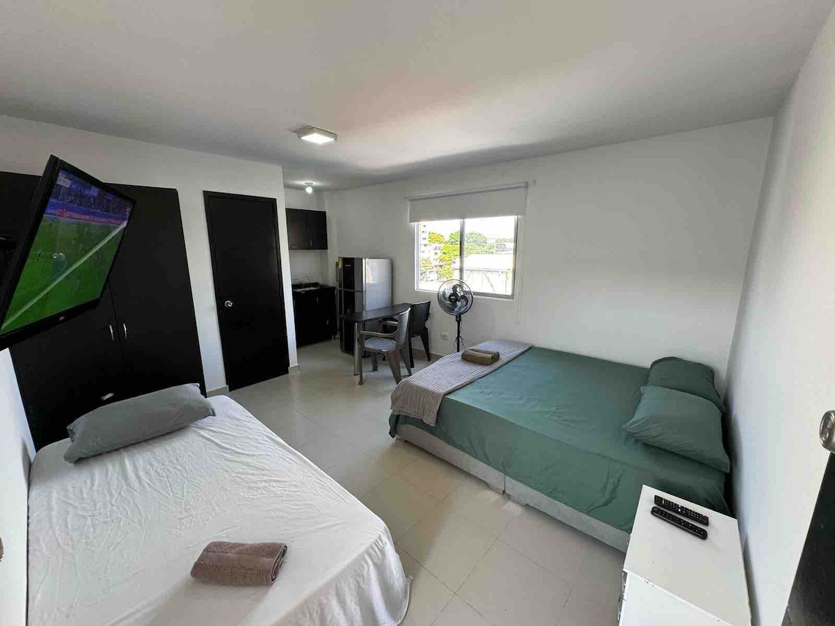 El apartaestudio se encuentra en el sur-centro de la ciudad de Cali, la ubicación es excelente debido a que es céntrico y de fácil acceso a transporte. Además, está cerca de supermercados como Merca Mio, tiendas d1, Ara y Dollarcity. Se encuentra cerca de los centro comerciales Palmetto Plaza y Cosmocentro. Está totalmente amoblado, cuenta con wifi, aire acondicionado, cama doble de 1,40cm, agua fría/caliente, nevera, estufa a gas, utensilios de cocina, cafetera, arrocera y sandwichera.