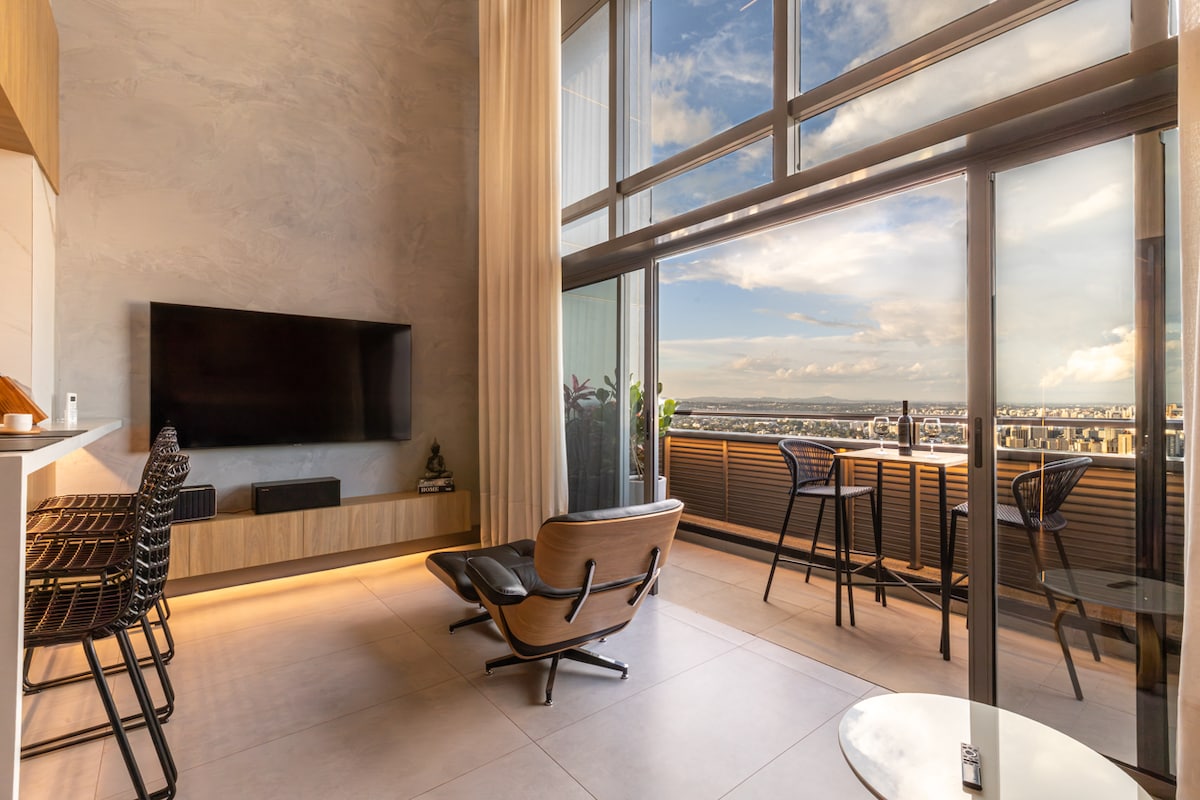Um refúgio nas alturas: conforto, sofisticação e uma vista de tirar o fôlego. Hospede-se no 31º andar do Edifício 7th e desfrute de uma vista panorâmica inesquecível de Curitiba. O Apto conta com decoração alto padrão, com todos os utensílios, uma cama Queen além de ter o privilégio de curtir o nascer do sol através das montanhas. Conforto, limpeza impecável e roupas de cama e banho são itens de extrema dedicação, comprovados por todos os hóspedes. Também possui uma vaga de garagem de cortesia.