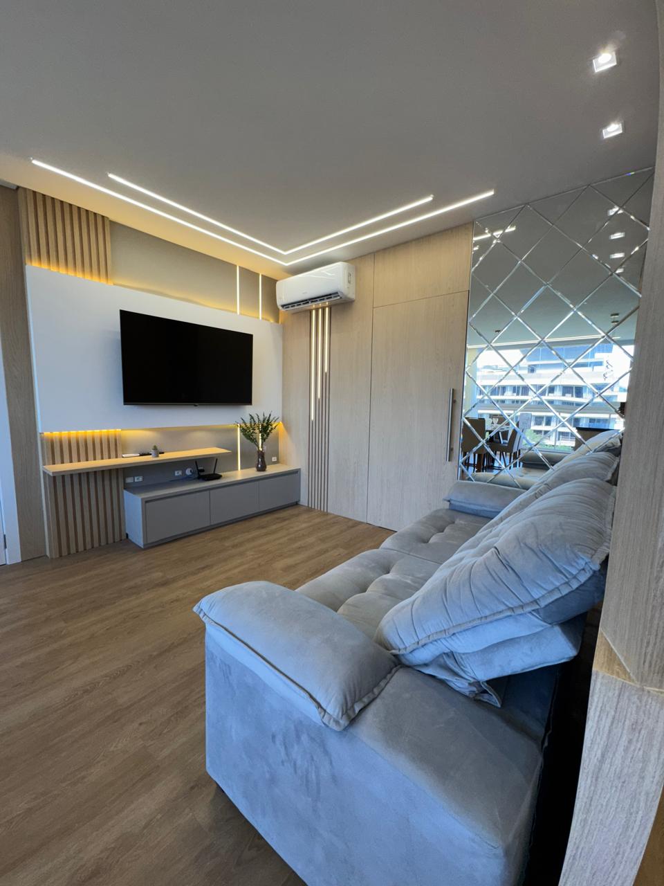 Modern and cozy apartment located in Residencial Sunny Flats, approximately 400 meters from Bombas beach in Bombinhas. It has a beautiful outdoor area with a swimming pool on the terrace, gourmet area, fire pit, games room, and kids' area. It has an integrated living room and kitchen with a dining table, a guest bathroom, 1 air-conditioned bedroom, a sofa bed in the living room, and a balcony with a private barbecue.
