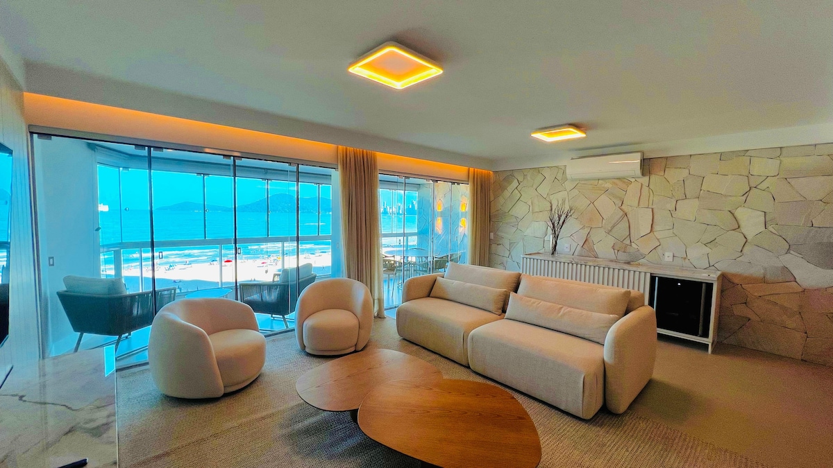 Triplex beira mar na praia de Bombas com churrasqueira privativa na cobertura e piscina coletiva. PÉ NA AREIA, literalmente. Uma das melhores opções de Bombas para quem busca uma localização exclusiva, aliada à comodidade de estar com o pé na areia. Você vai desfrutar de momentos inesquecíveis com sua família e amigos. A poucos metros de bares e restaurantes. Vista exuberante dos três andares para você apreciar a praia e bela natureza do costão de Bombas. Ar-condicionado nos 4 quartos